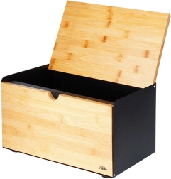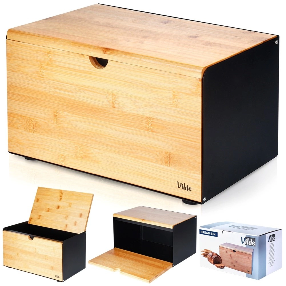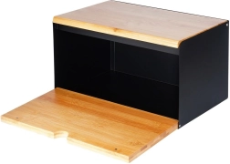 Elegant brødkasse i en kombination af metal og bambus holder bagværk friskt i længere tid og beskyttet mod udtørring. Den tilbyder to åbningsmåder – oppefra og forfra – hvor det øverste låg fungerer som en skærebræt. Mat sort finish kombineret med bambus giver køkkenet et moderne design, og beskyttende filtfødder sikrer stabilitet.