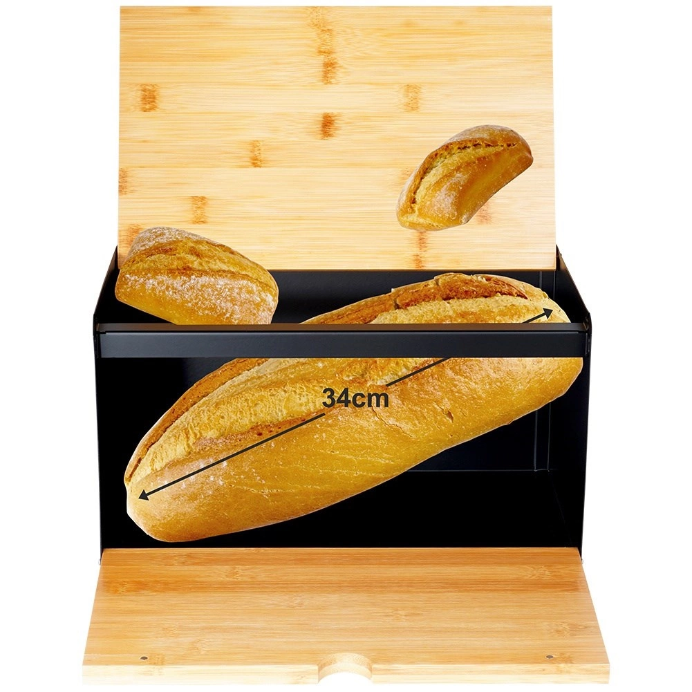 Praktisk 2-i-1 løsning: det øverste bambuslåg fungerer som en robust skæreplade til brød og bagværk direkte ved brødkassen.