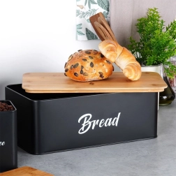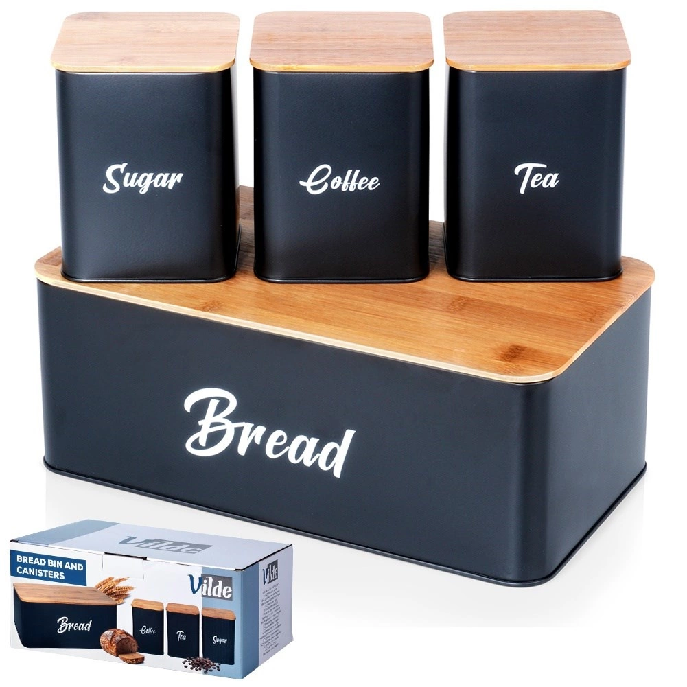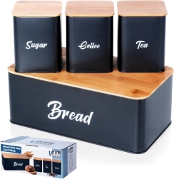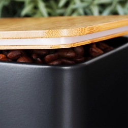 Brødkassen i robust, pulverlakeret metal har rene linjer og et praktisk låg af bambustræ, som kan bruges som skærebræt. Metalkonstruktionen beskytter bagværk mod at blive klemt og begrænser udtørring. De tre matchende dåser med bambuslåg holder sukker, kaffe og te aromatiske længere og nemt organiseret.