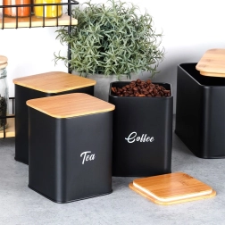 Tre metaldåser med bambuslåg holder tørvarer friske længere. Tydelige betegnelser og et ensartet look sikrer orden og elegance på køkkenbordet.