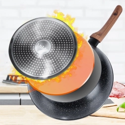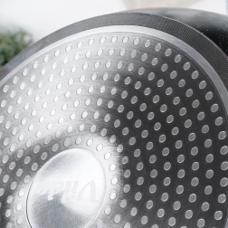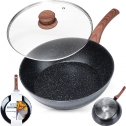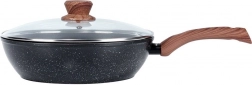 Dyb granitpande med en diameter på 28 cm og glaslåg til nem stegning og sautering. Takket være den non-stick belægning laver du mad med minimalt fedt, den fordeler varmen jævnt og er egnet til alle typer komfurer inkl. induktion. Det ergonomiske håndtag med trælook bliver ikke varmt, og panden kan tåle opvaskemaskine.