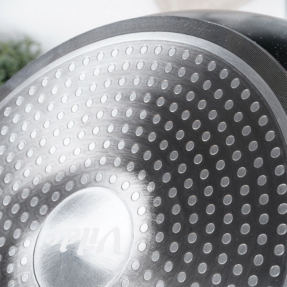 Et massivt aluminiumstøbegods sikrer hurtig og jævn opvarmning, hvilket sparer tid og energi. Den non-stick granitoverflade minimerer fastbrænding og gør rengøringen lettere. Det ergonomiske håndtag med skridsikker overflade bliver ikke varmt under madlavningen, og hullet i enden gør det nemt at hænge op.