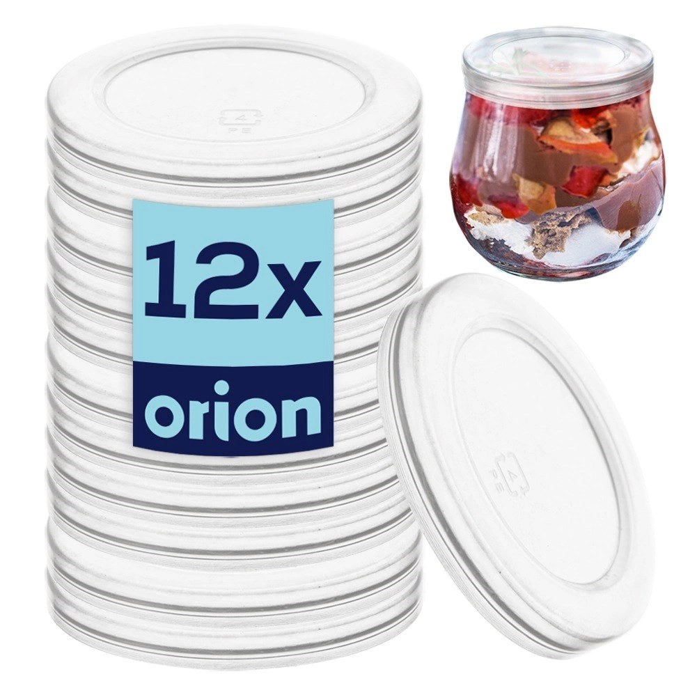 Praktisk sæt med 12 gennemsigtige plastlåg med en diameter på 5,5 cm til yoghurt- og dessertglas på 130 ml. Lågene sikrer tæt lukning, bevarer friskheden og beskytter indholdet under opbevaring og transport. Fremstillet af holdbart materiale til gentagen brug. Dokumenteret kvalitet fra ORION.