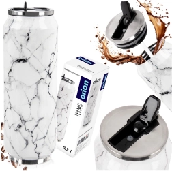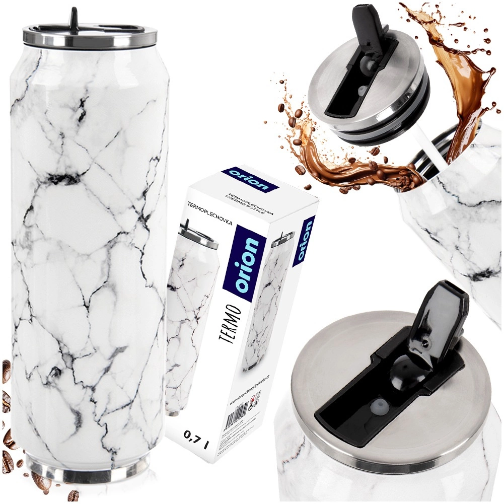 Stilfuld termokop med kapacitet på 700 ml i design som en hvid marmordåse holder dine drikke varme i op til 12 timer og kolde i op til 8 timer. Takket være dobbeltvæg med vakuumisolation, tætsluttende låg og flip-n tud med sugerør kan du drikke komfortabelt uden at vippe og uden frygt for spild.