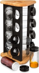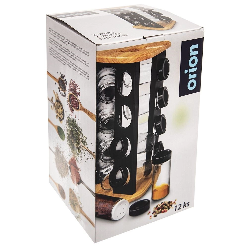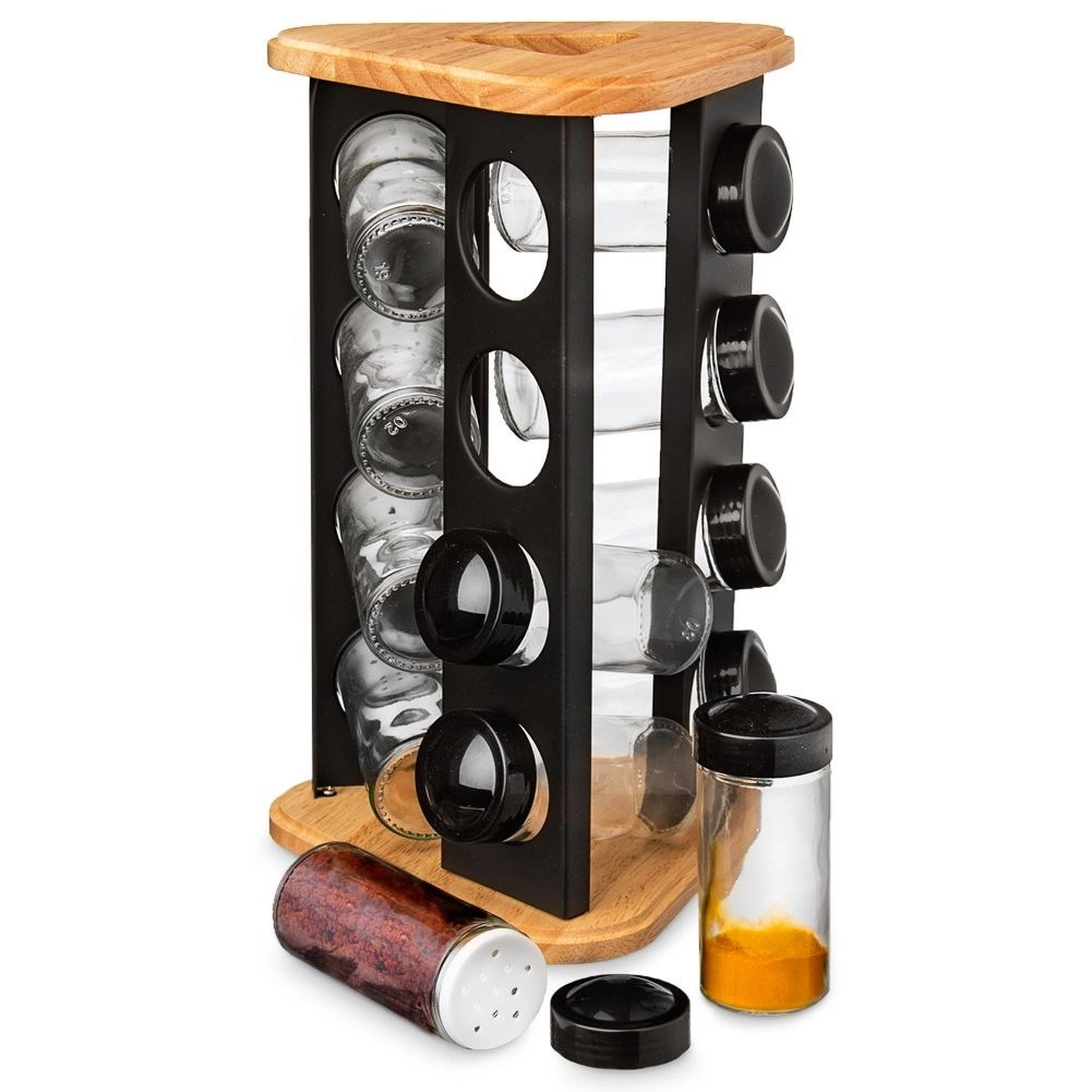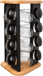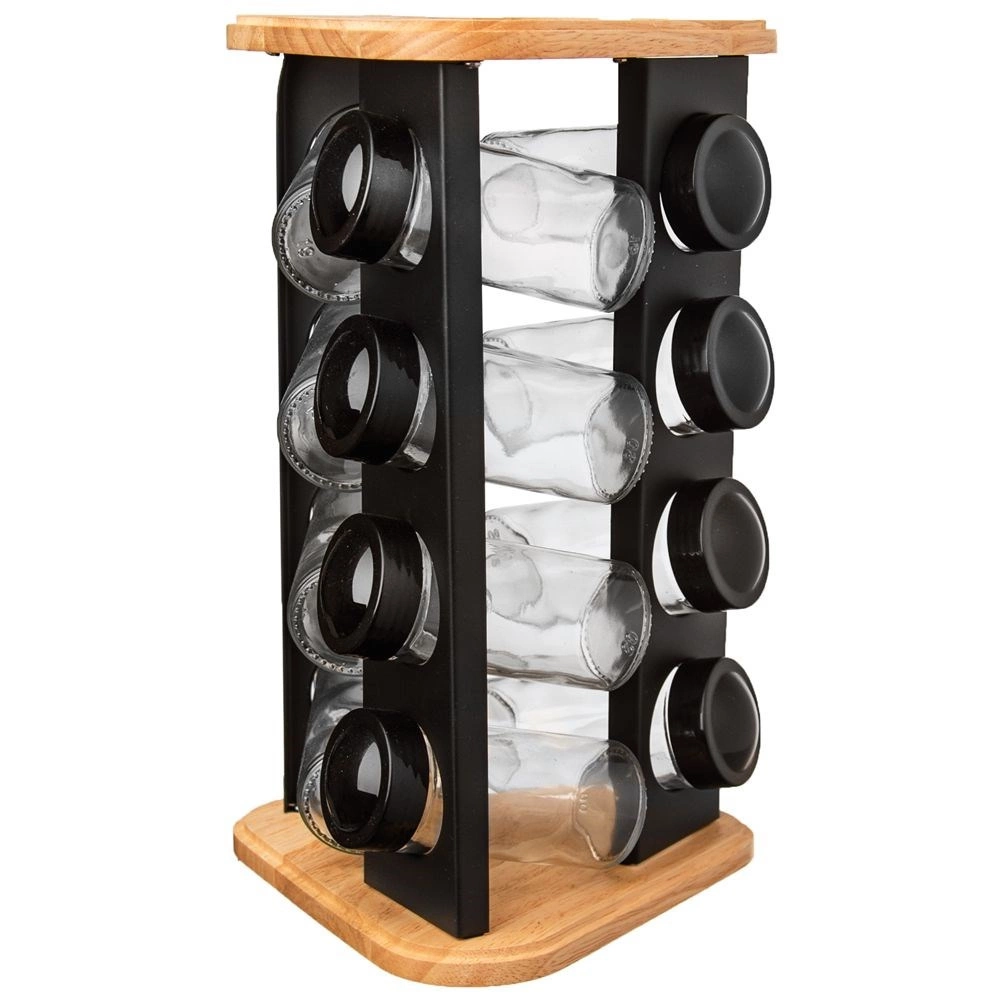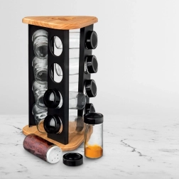 Stativet af træ og robust sort metal er holdbart og stabilt, og det klare glas gør det nemt at tjekke indholdet ved første øjekast. Glasdelene (uden låg) kan vaskes i opvaskemaskinen. Det minimalistiske design passer i ethvert køkken og hjælper med at holde orden samt en flot præsentation af dine yndlingskrydderier.
