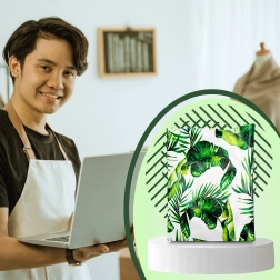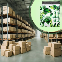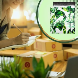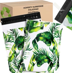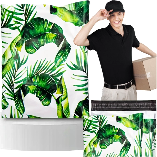 Stilfulde og robuste forsendelsesposer med tropisk bladmønster i størrelsen 255 × 370 mm, pakket á 50 stk. Takket være den selvklæbende strimmel sikrer de hurtig indpakning, sikker forsegling og beskyttelse mod fugt under transport.
