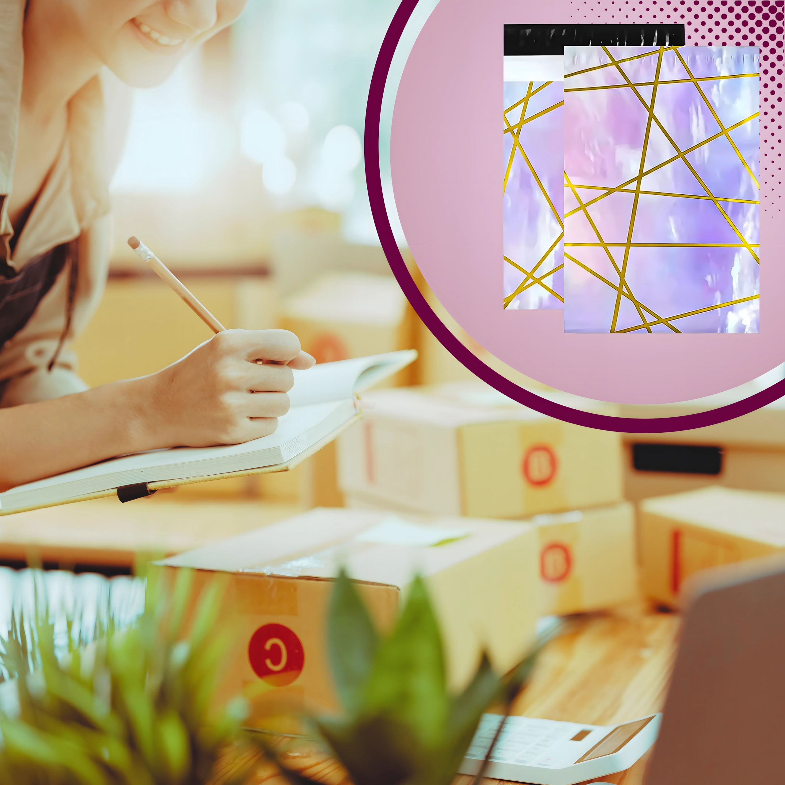Holdbare og stilfulde plastpostkuverter til sikker forsendelse af varer. Mål 255 × 370 mm, pakke med 50 stk. Takket være den selvklæbende lukning er indpakningen hurtig og bekvem, og indholdet er desuden beskyttet mod uautoriseret åbning. Det elegante lilla-guld look giver dine forsendelser et professionelt udtryk. Velegnet til både webshops og private forsendelser. Sikker lukning, stærkt materiale, hurtig pakning.