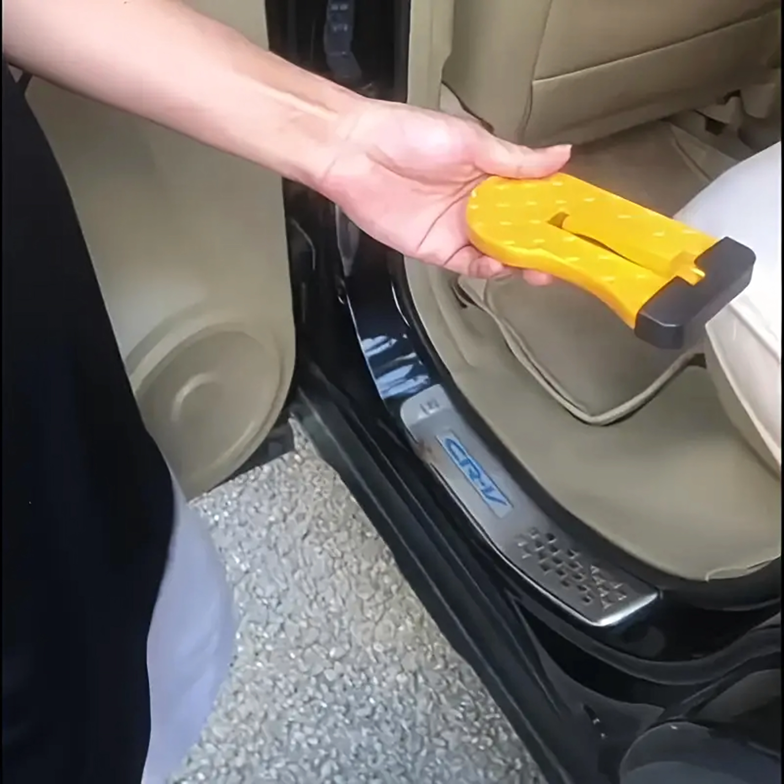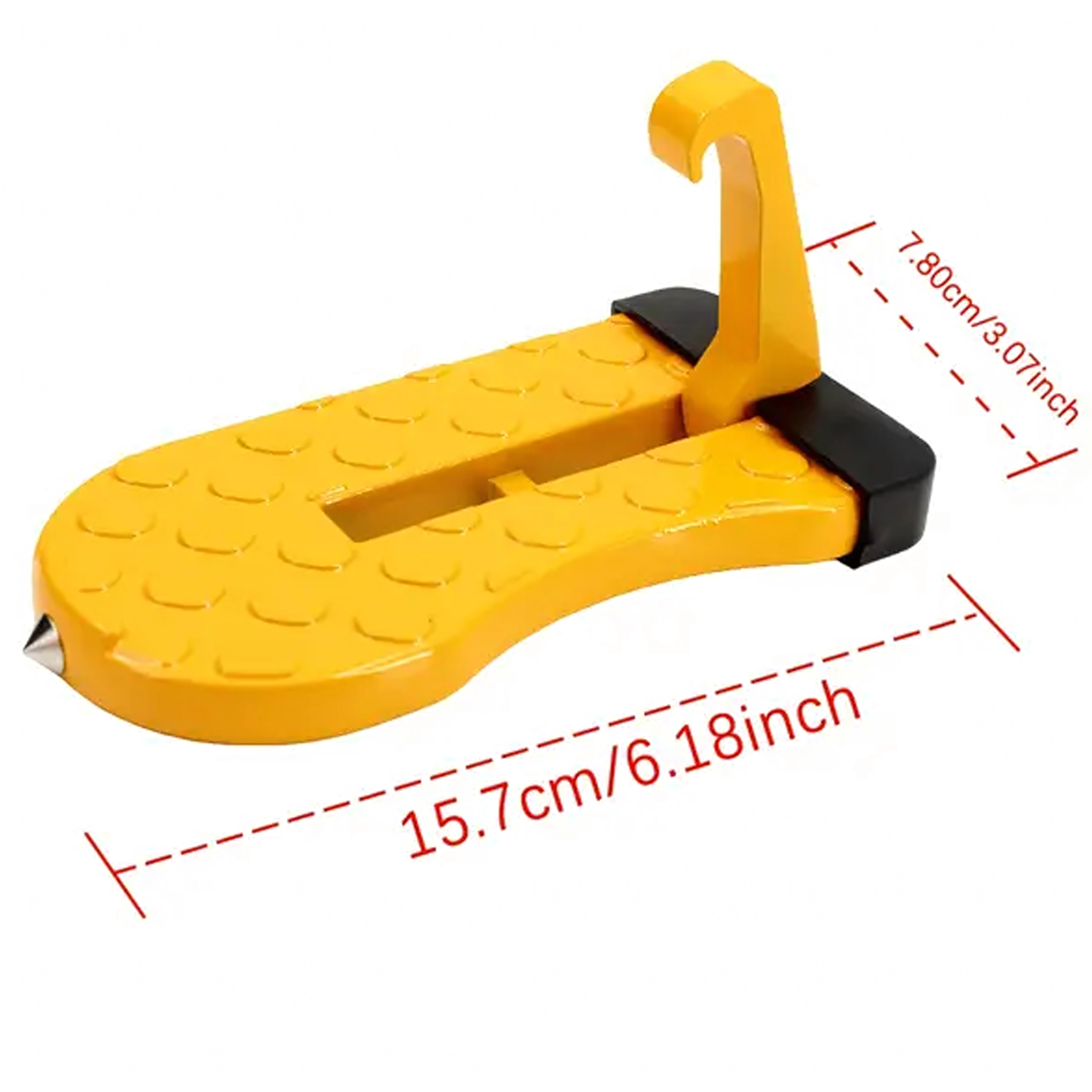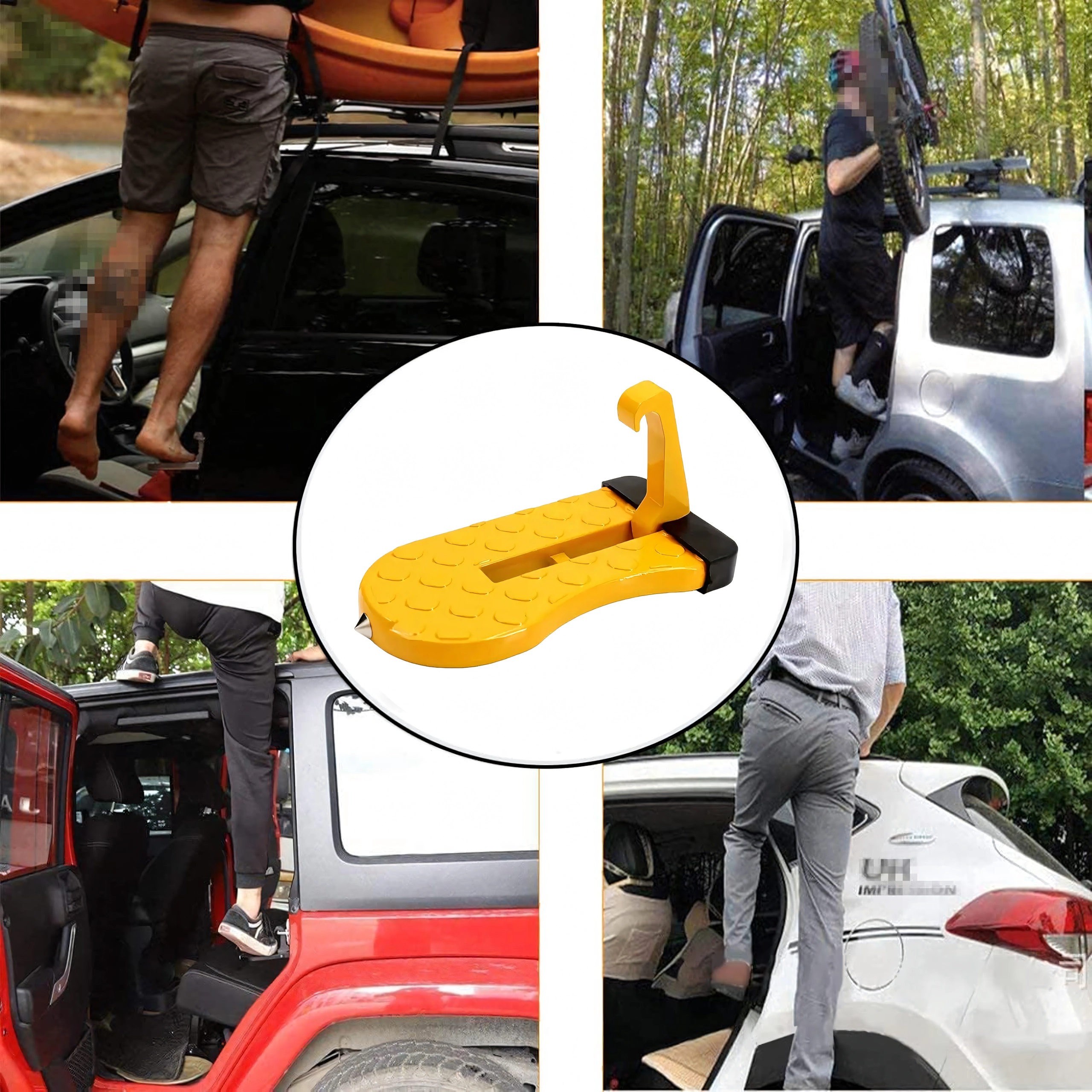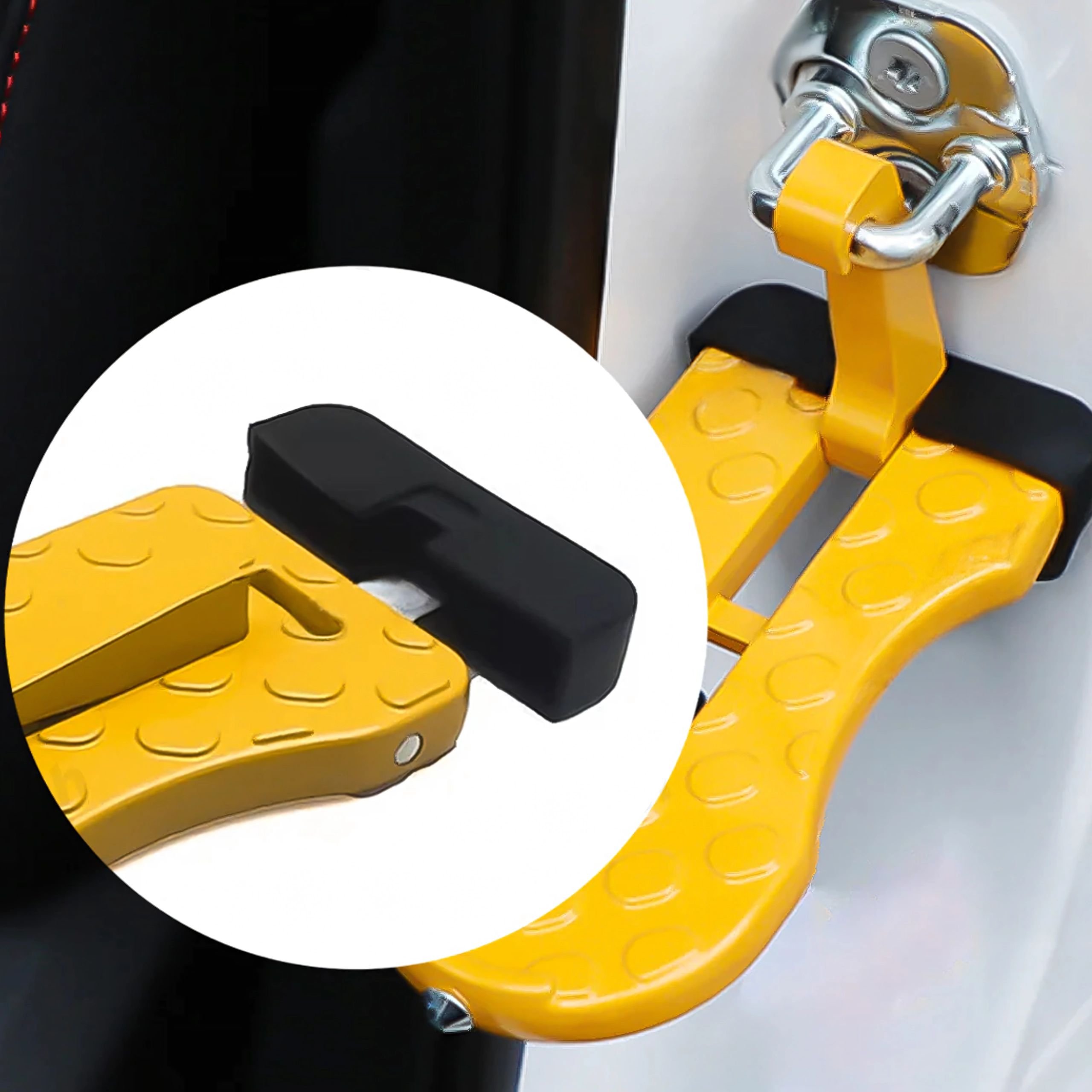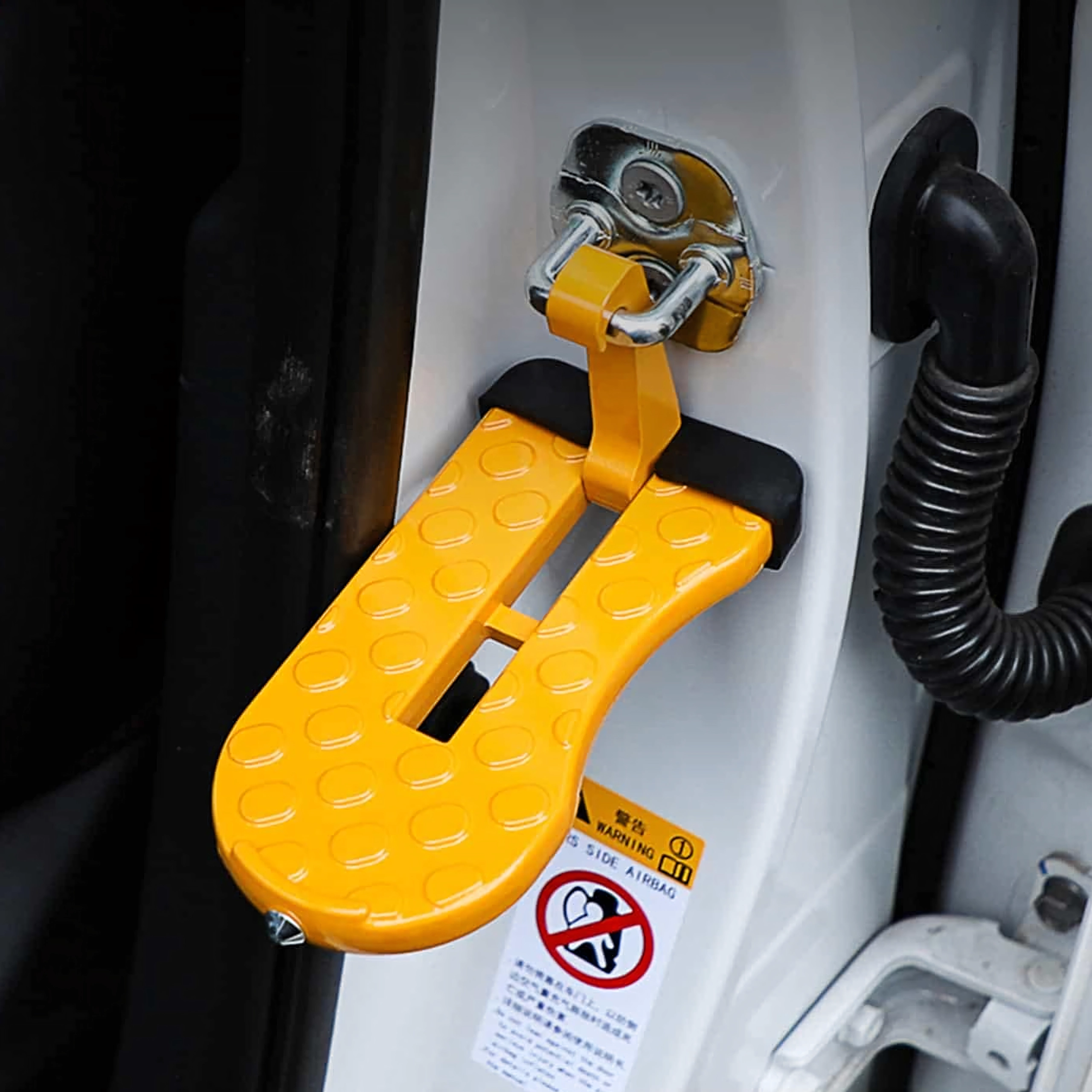 Praktisk og holdbart fodtrin til bildøre, som gør det nemt at komme op på bilens tag – ideelt til tagbokse, holdere og bilvask. Det er let, sammenklappeligt, af aluminium og skridsikkert, og kan desuden fungere som et nødhammer.