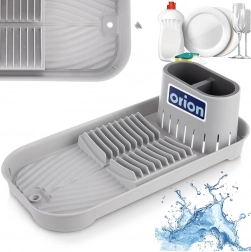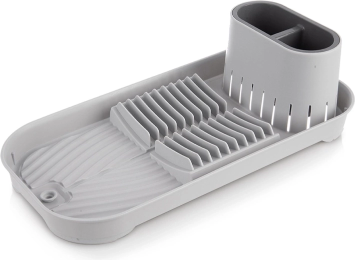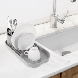 Kompakt gråt opvaskestativ med aftagelig bestikboks, plads til op til 9 tallerkener samt krus og skåle. Takket være integreret afløb med lukke ledes vandet direkte fra rillerne, beskytter køkkenbordet og holder området omkring vasken tørt. Stabil, skridsikker bund og nem vedligeholdelse er en selvfølge. Mål 39 × 19,5 × 11 cm.