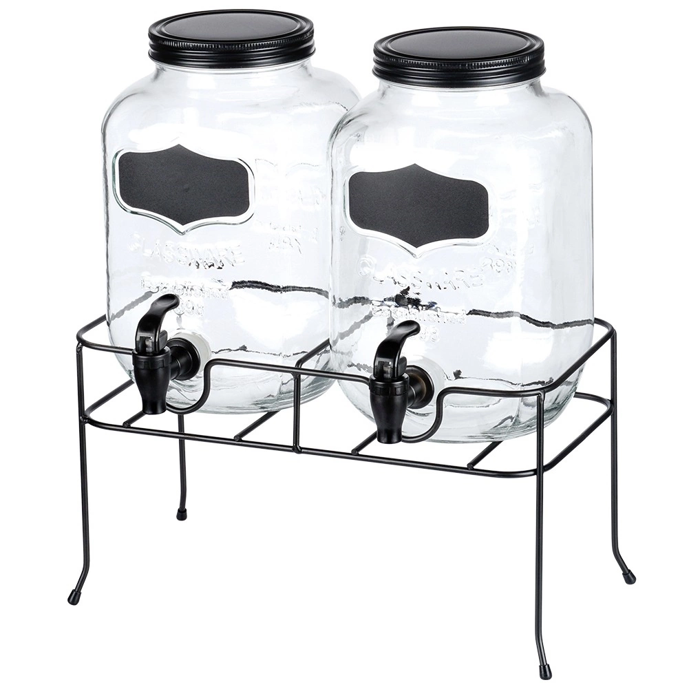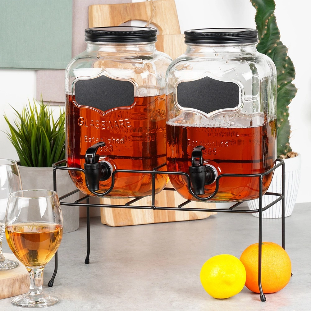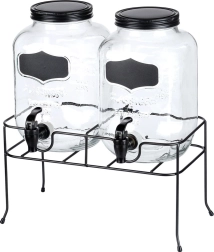 Det robuste metalstativ i sort giver den ideelle højde til komfortabel tapning og har gummifødder mod at glide og ridse bordpladen. Sættet er perfekt til lemonader, juicer, iste, smagstilsat vand eller punch ved familiefester, grillarrangementer og i professionelle miljøer, hvor det gør det muligt at præsentere to forskellige drikke elegant.