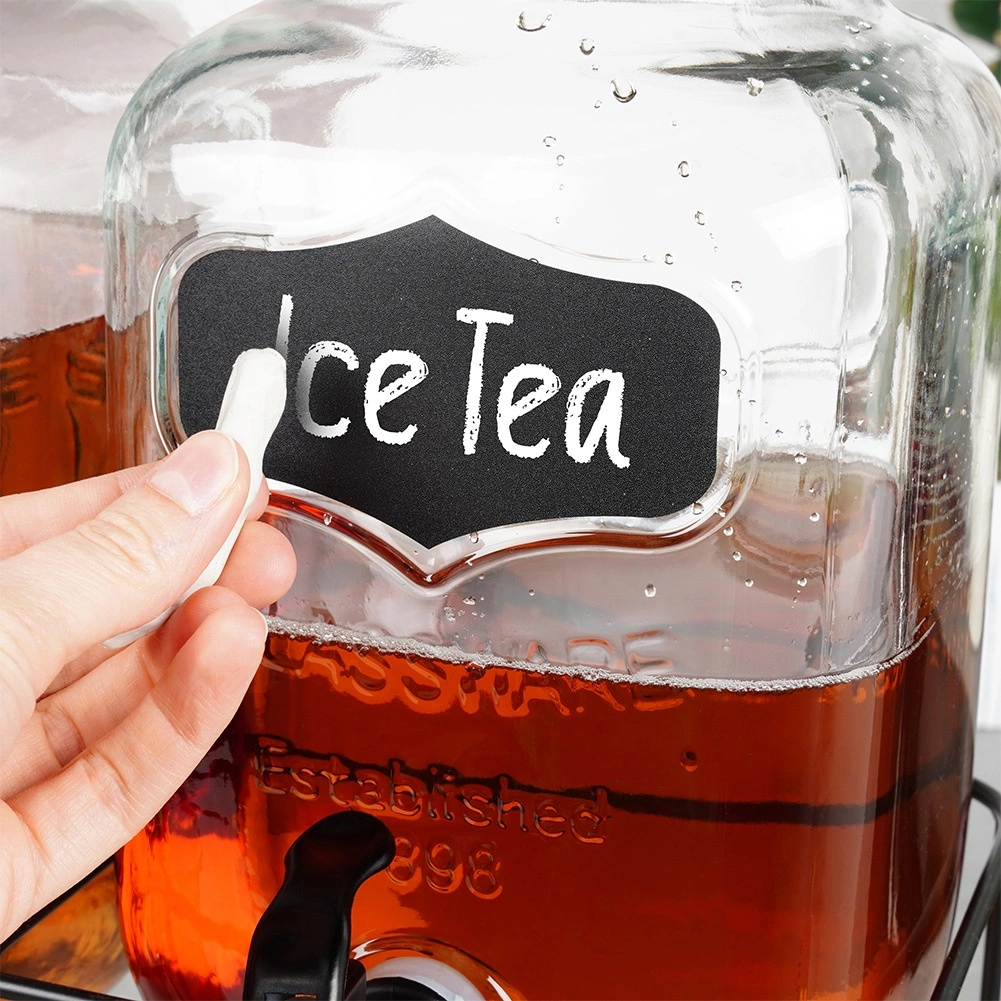Dette praktiske sæt med to drikkedispensere bringer orden og stil til enhver servering. Hver glasbeholder har en kapacitet på 4 l og er udstyret med en plastikhane med tætning for jævn udskænkning. Takket være den brede åbning er det nemt at fylde frugt eller isterninger i, og låget beskytter drikken mod insekter og snavs. Den tavleagtige flade på forsiden gør det muligt at skrive med kridt.