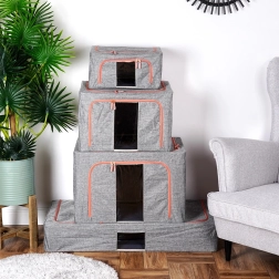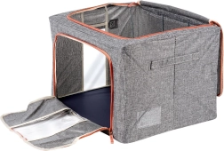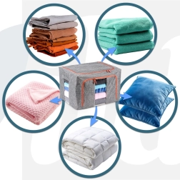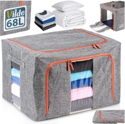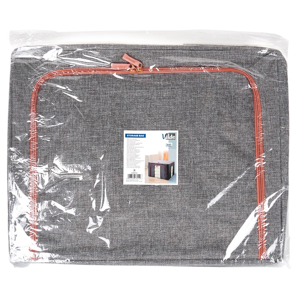 Hold hjemmet organiseret med den rummelige pose på 66 l og mål 50 × 40 × 33 cm. Det slidstærke polyesterstof i grå melange med kontrastlynlås beskytter pålideligt tekstiler mod støv, fugt og skadedyr. Takket være den robuste indvendige konstruktion holder den formen og kan nemt skubbes ind i skabet eller under sengen.
