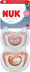 NUK First Choice Night sutter er designet til maksimal komfort og sund udvikling for babyen. Den ortodontiske og ekstra flade form giver tungen tilstrækkelig plads, understøtter naturlig sutning og minimerer trykket på kæbe og tænder. Den bløde zone på overfladen er behagelig mod følsom hud, og suttedelen af kvalitets-silikone har høj accept hos børn.