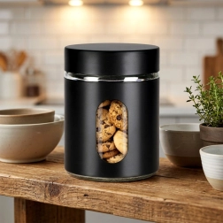 Det elegante vindue i den sorte kappe gør det nemt at tjekke indhold og mængde uden at åbne, så du altid har styr på dine forsyninger.