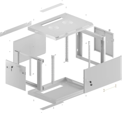 Takket være Flat Pack-emballagen er skabet let at transportere selv i mindre biler, og samlingen klares hurtigt ved hjælp af de overskuelige manualer. Integrerede 19" skinner med U-mærkning gør det nemt at montere udstyr og sørger for overskuelig kabelhåndtering.