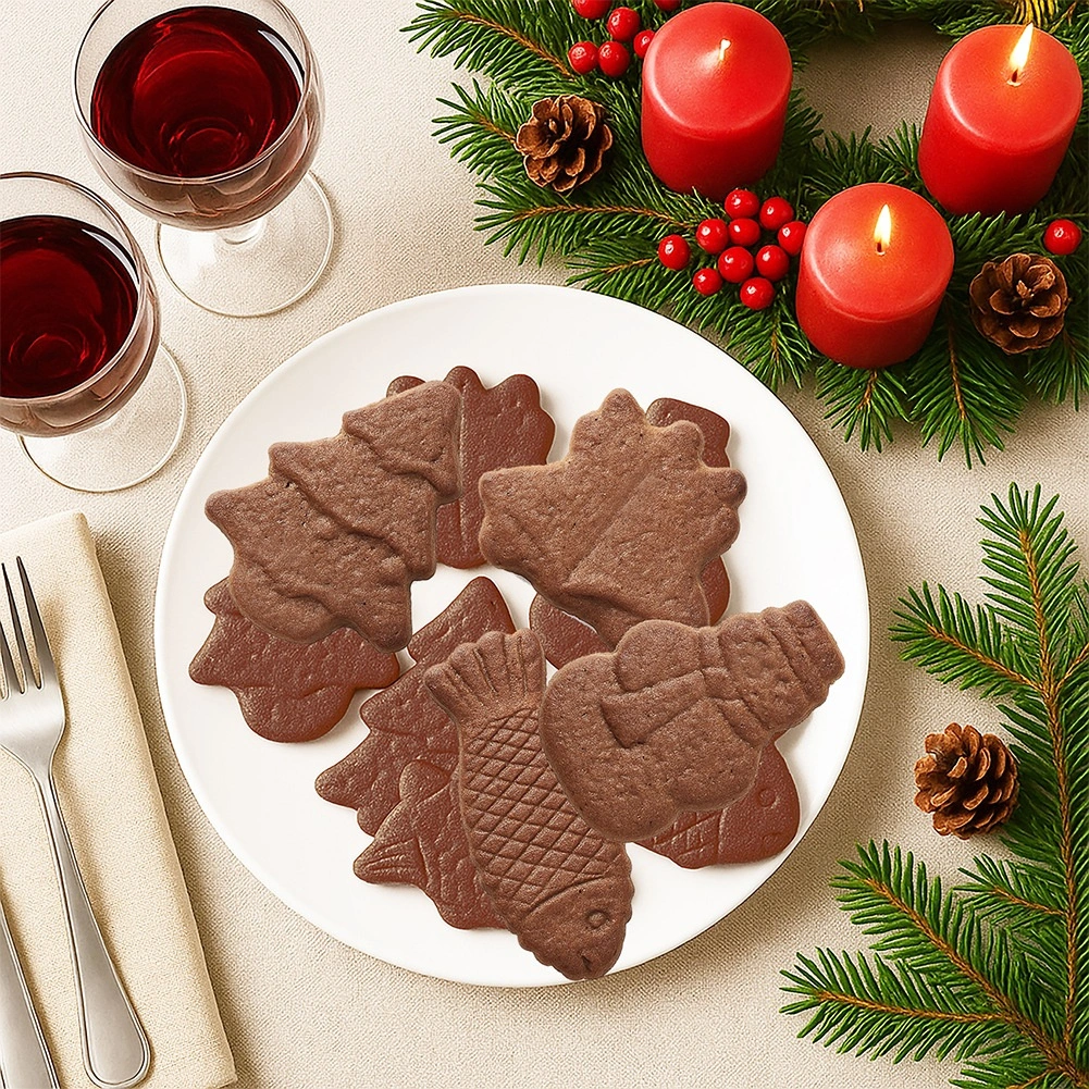 Formen byder på juletræer i to størrelser, en snemand, klokker og en fisk – ideel til småkager og chokolader med et festligt udtryk.