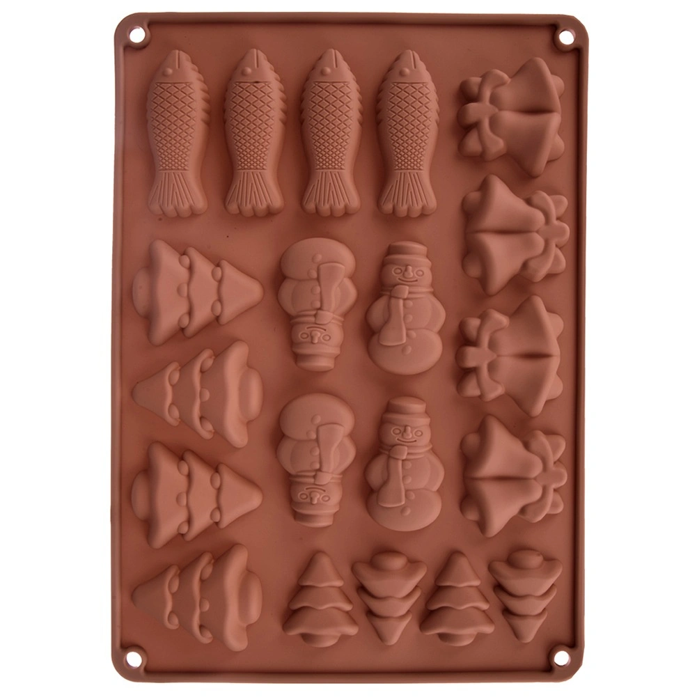 Praktisk silikoneform til nem bagning og støbning af chokolade i vintermotiver. Takket være 20 huller laver du på én gang søde sager i fem former – juletræ, snemand, klokke og fisk. Materialet er non-stick, fleksibelt og varmebestandigt fra -40 til +200 °C, velegnet til ovn, mikroovn og fryser og kan tåle opvaskemaskine.
