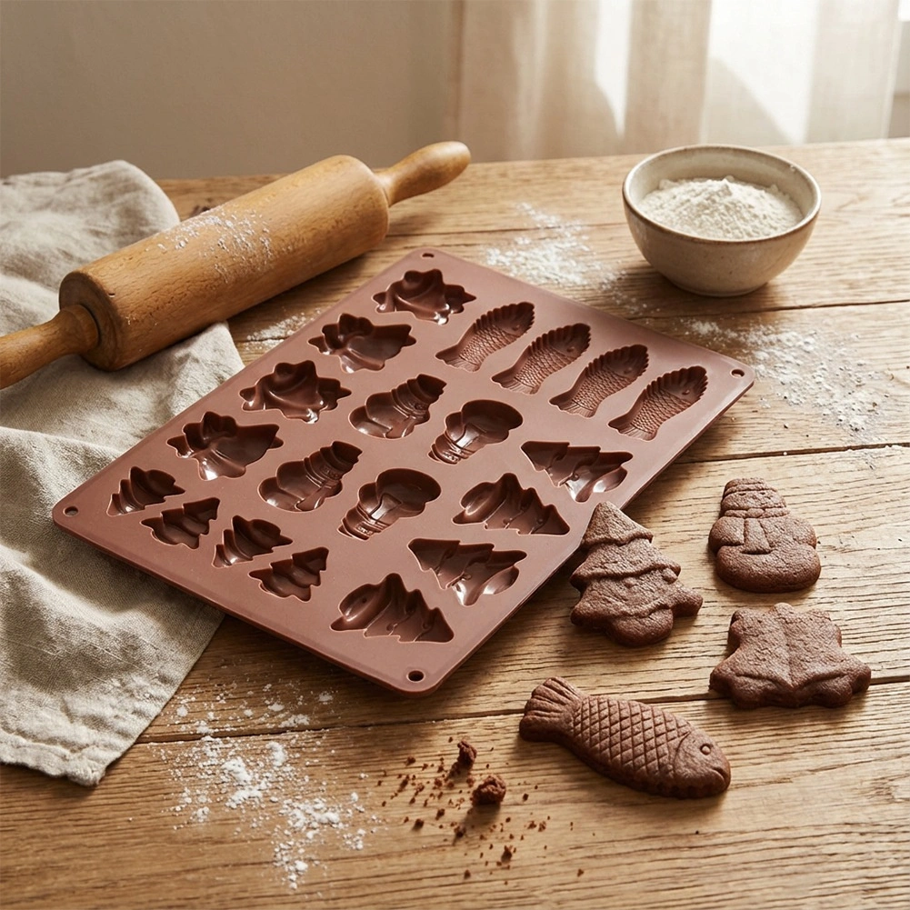 Lav op til 20 styk ad gangen i motiverne juletræ, snemand, klokke og fisk – ideelt til højtidsservering.