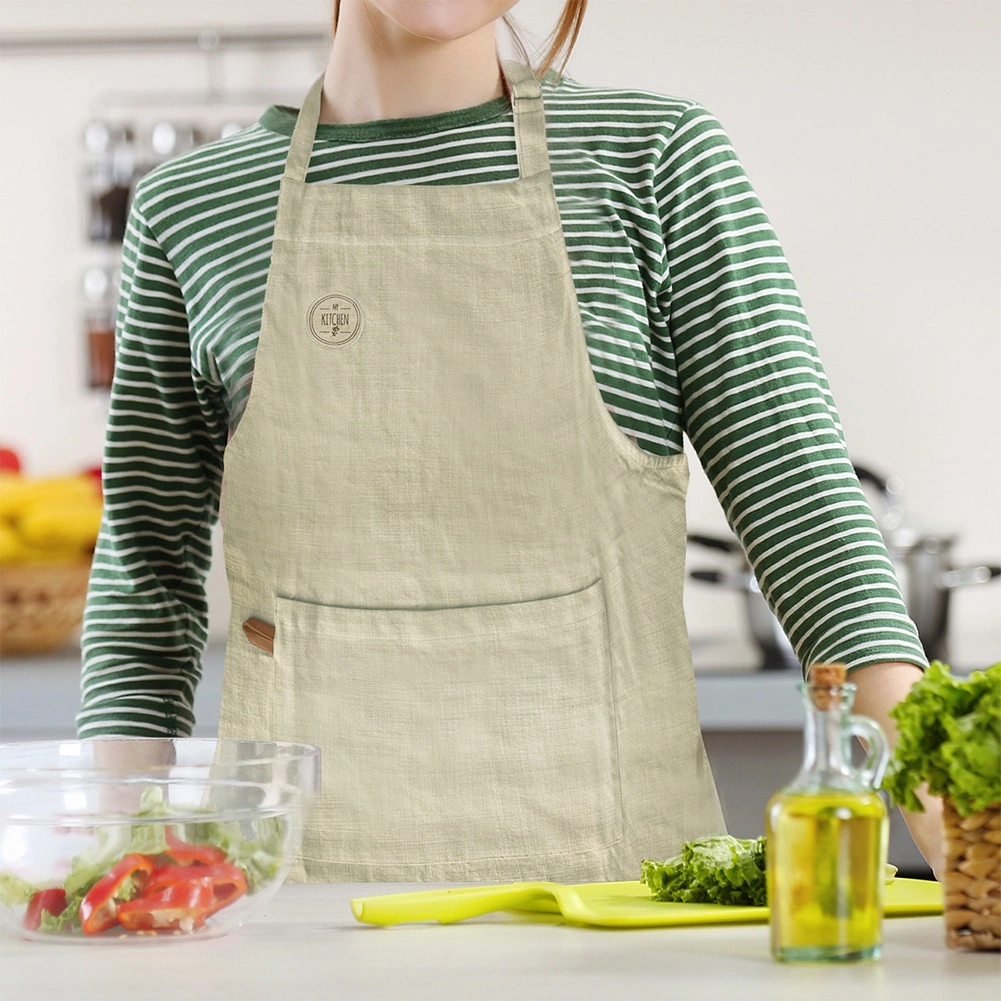Den justerbare nakkerem med spænde og de lange bindebånd i livet sikrer, at forklædet passer enhver figur. Den store forlomme holder grydeskeer, viskestykke, krydderier eller en opskriftsseddel tæt på – ideelt til hjemmekokke, grillentusiaster og kreativt arbejde i værkstedet.