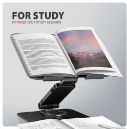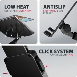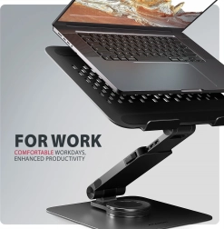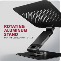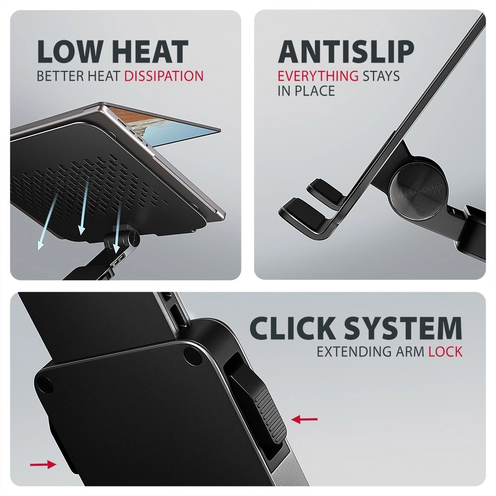 Ergonomisk aluminiumsstativ til bærbare og tablets fra 10" til 17,3" med 360° drejeligt arm, højdejustering og udtrækkelig arm for perfekt tilpasning. Stabil konstruktion, belastning op til 5 kg, skridsikre overflader og ventilationshuller for bedre køling af enheder.