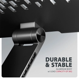 Det robuste hus af holdbare aluminiumstøbninger sikrer stabilitet og lang levetid. Skridsikre flader beskytter enheden mod at glide og mod ridser, og ventilationshuller sikrer effektiv køling, som øger ydeevne og levetid på den bærbare. Stativet kan nemt foldes til kompakte mål for bekvem transport.