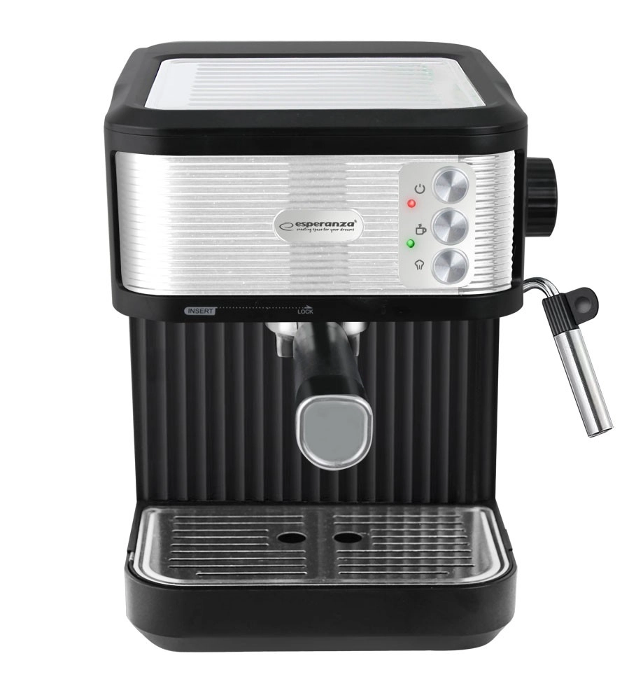 Stilfuld stempel-kaffemaskine Esperanza CATURRA med 20 bar tryk, 1,8 l vandtank og dampspids til luftig mælkeskum. Byder på hurtig tilberedning af espresso, kopvarmer og nem rengøring takket være den aftagelige drypbakke.