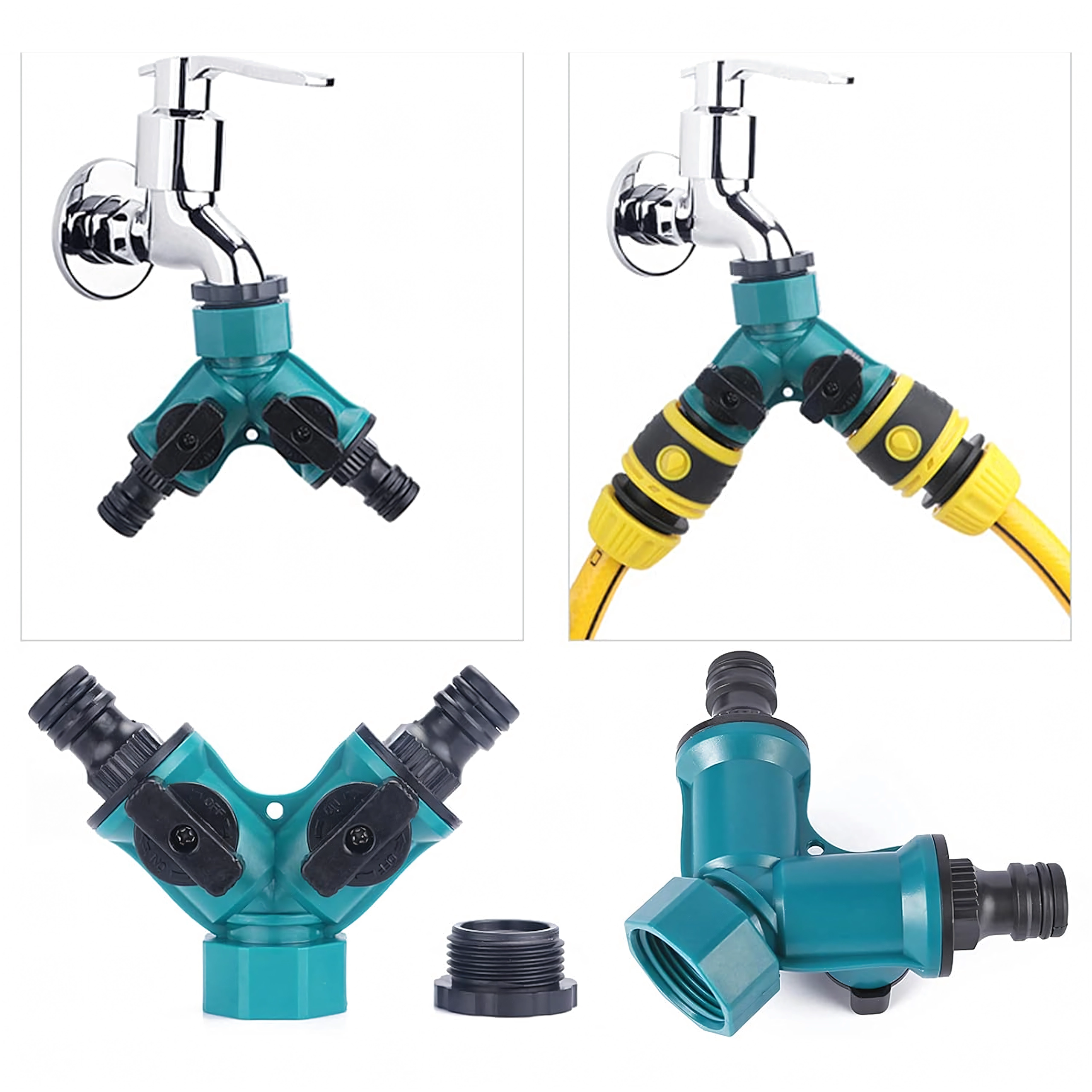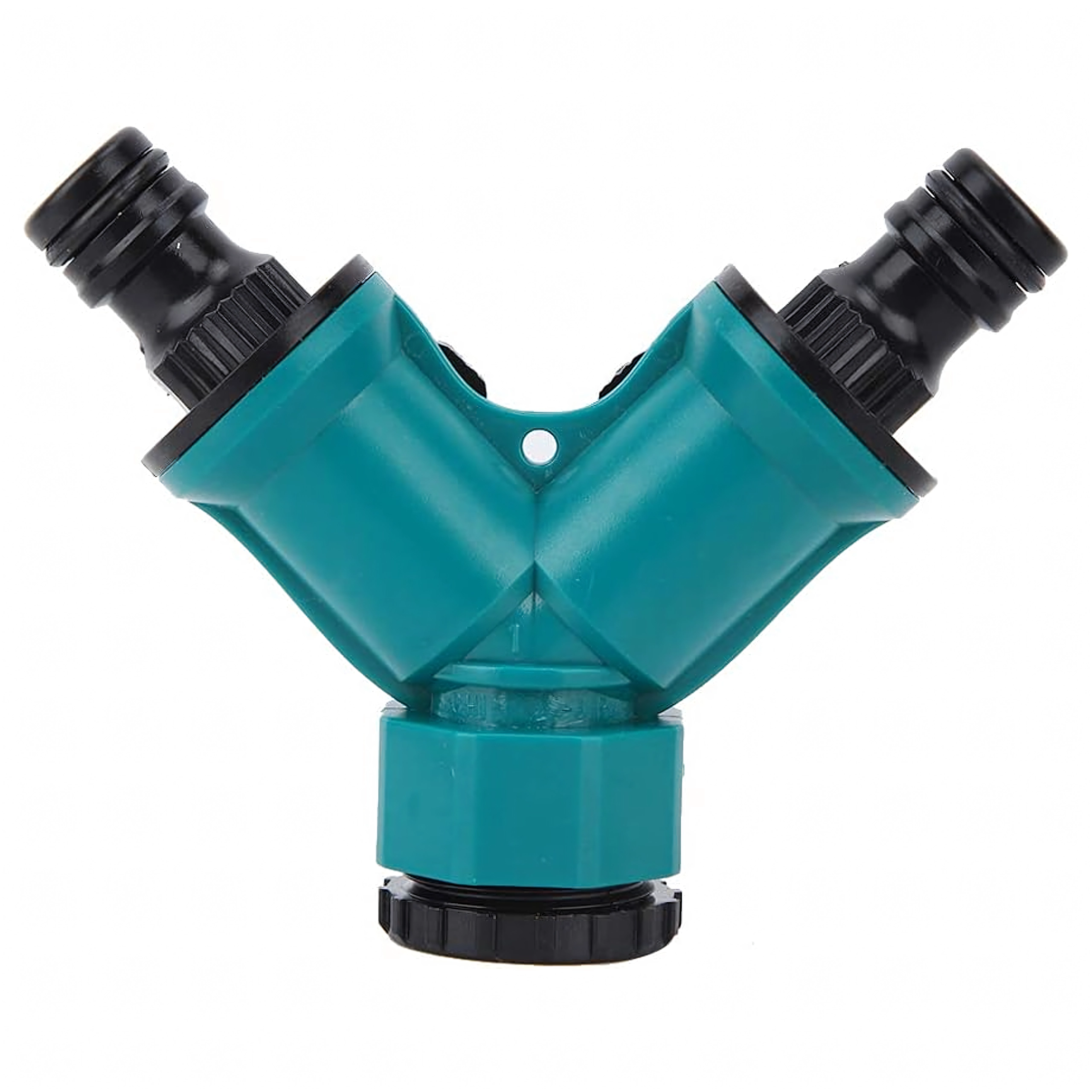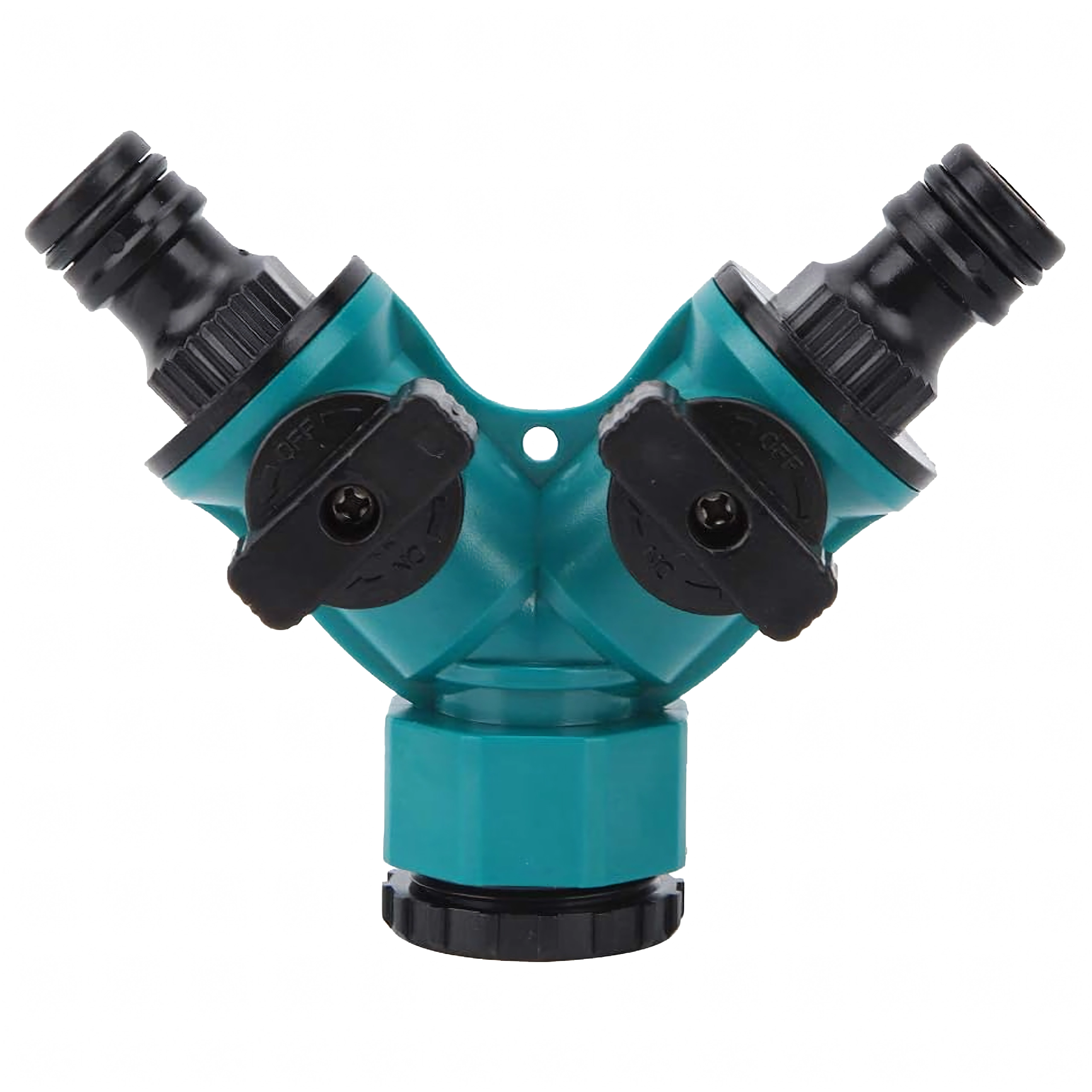Udvid mulighederne for din udendørshane med en Y-fordeler, der lader dig tilslutte to slanger samtidig og styre hver for sig. Det robuste plastkorpus med metalgevind og lynkoblinger giver pålidelig tætning og nem montering blot ved håndopstramning.