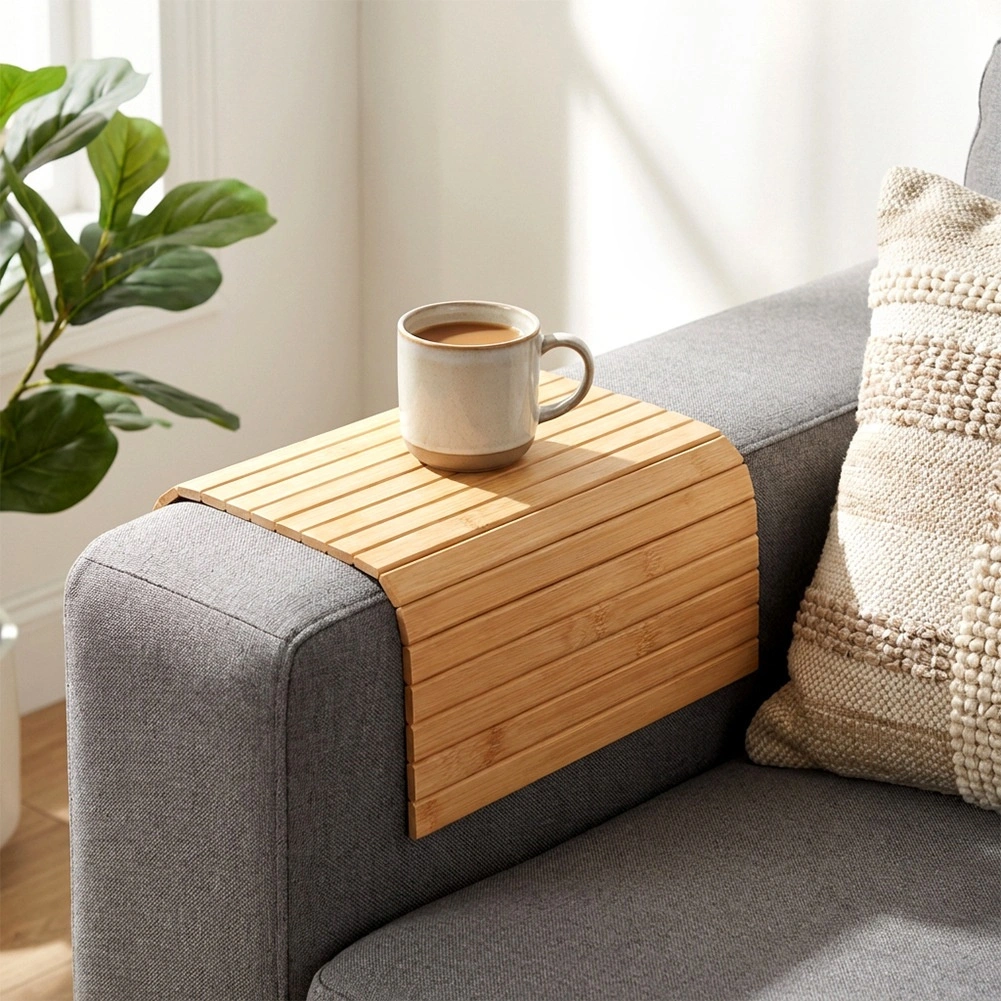 Lamellerne tilpasser sig armlænets form og skaber en plan flade til kop, glas eller småting – en praktisk løsning uden sidebord.