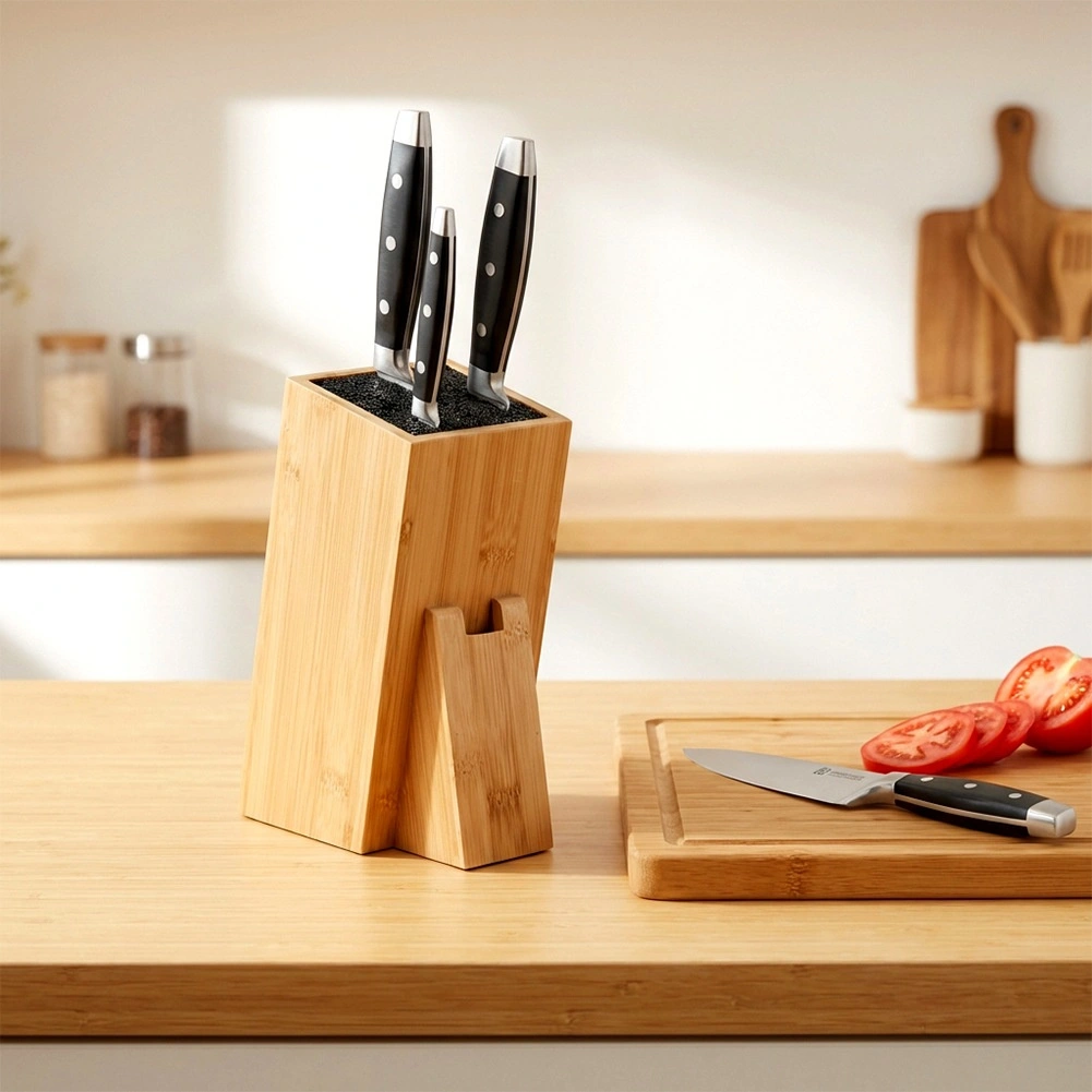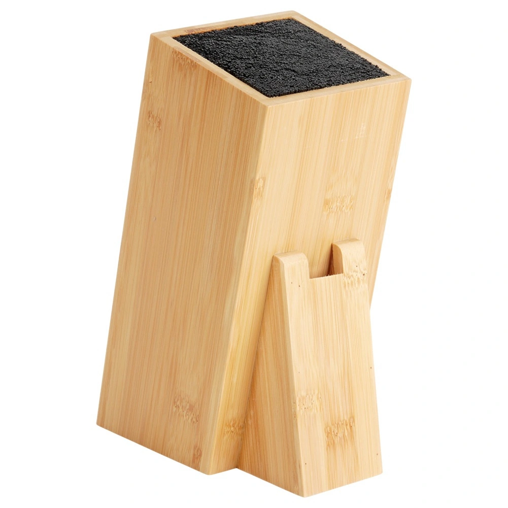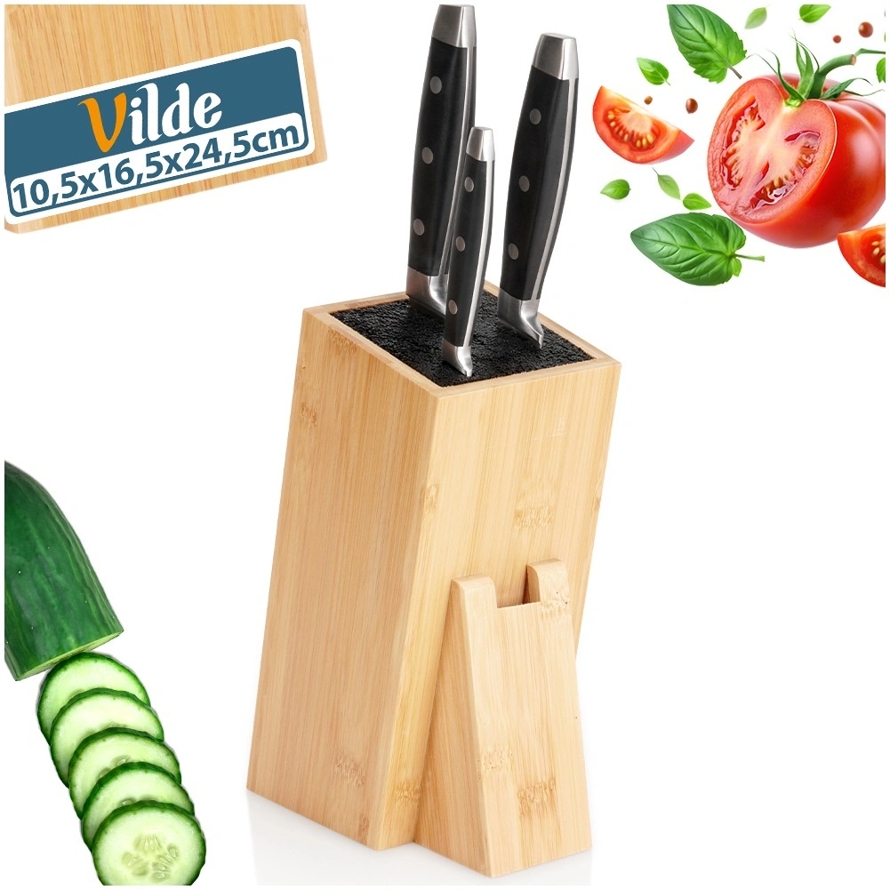 Universel stander til knive og køkkenredskaber i kvalitets bambustræ kombinerer naturligt udseende, stabilitet og praktisk opbevaringsløsning. Den tætte udtagelige fiber indeni blokken tilpasser sig enhver klinge, holder den sikkert på plads og beskytter æggen mod at blive sløv. Det skrå design sikrer nem ind- og udtagning af knive.