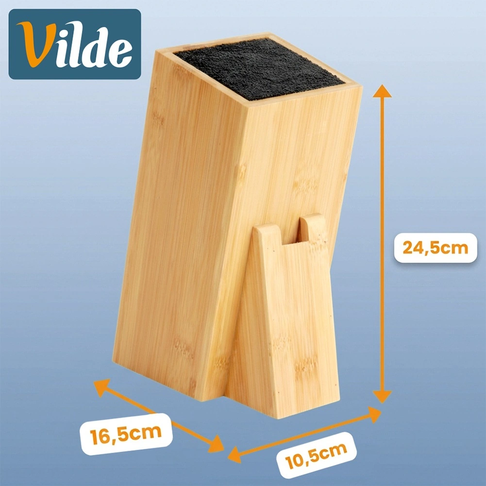 Takket være de kompakte mål 10,5 × 16,5 × 24,5 cm passer blokken nemt på køkkenbordet og holder dine redskaber altid lige ved hånden. Bambus er et holdbart, hygiejnisk og bæredygtigt materiale, så standeren er ikke kun praktisk, men også skånsom mod naturen. Filtpuder medfølger for skånsom og stabil placering på bordpladen.