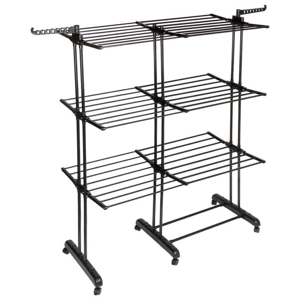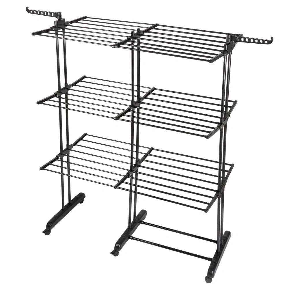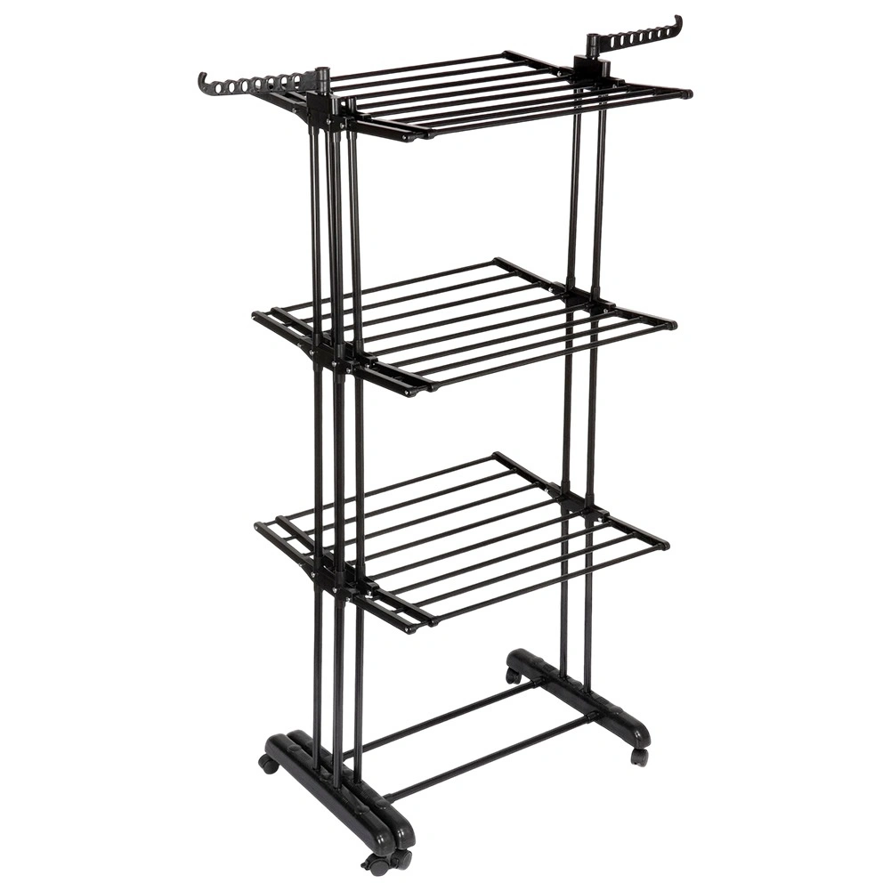 Det vertikale XXL-tørrestativ i elegant sort er ideelt til lejlighed, vaskerum og altan. Tre uafhængige niveauer og seks separat nedklappelige vinger gør det nemt at tilpasse pladsen til både længde og mængde af tøj. På siderne finder du arme med huller til bøjler, nederst en praktisk hylde f.eks. til sko.