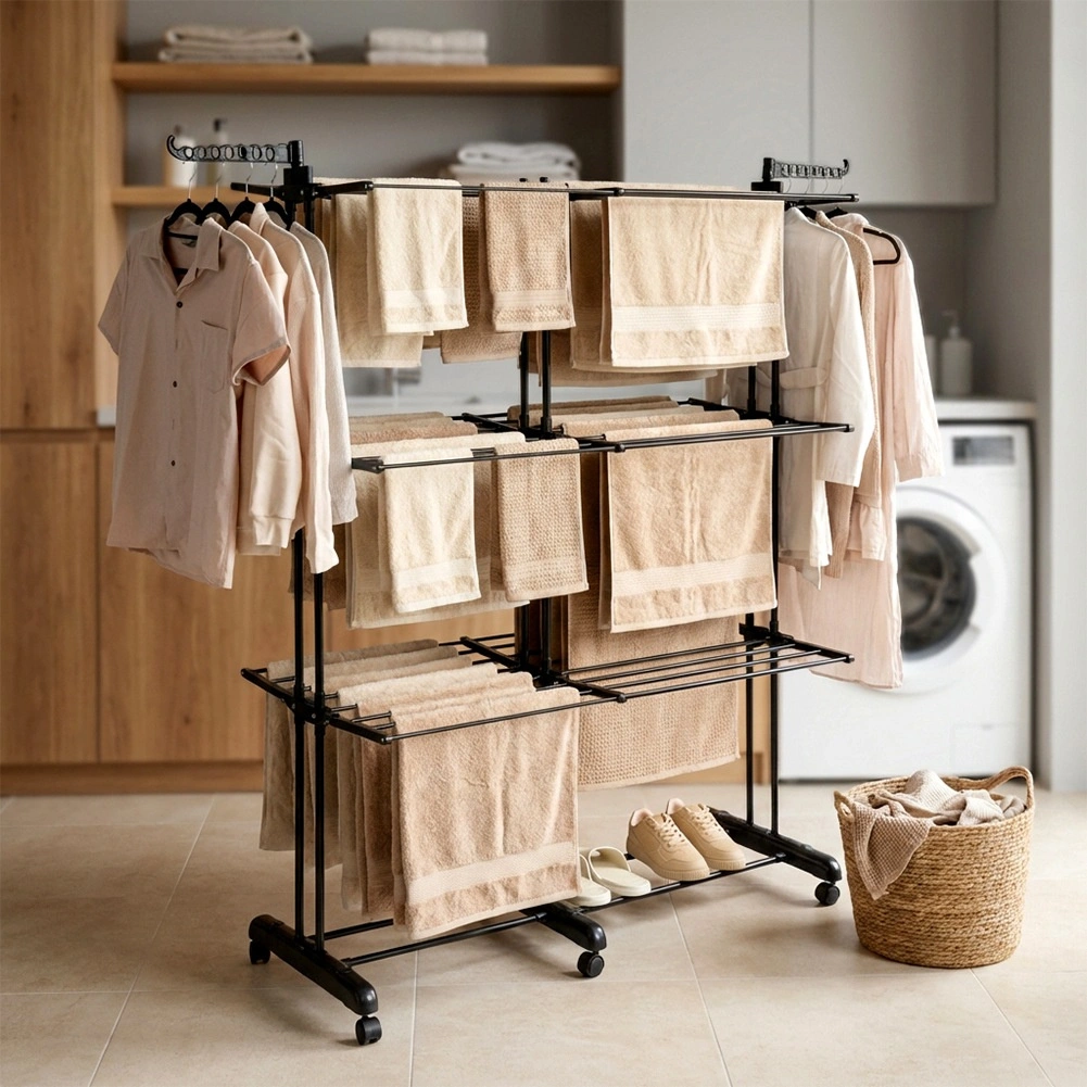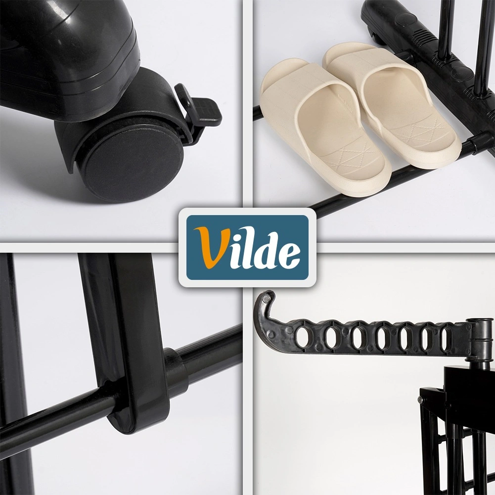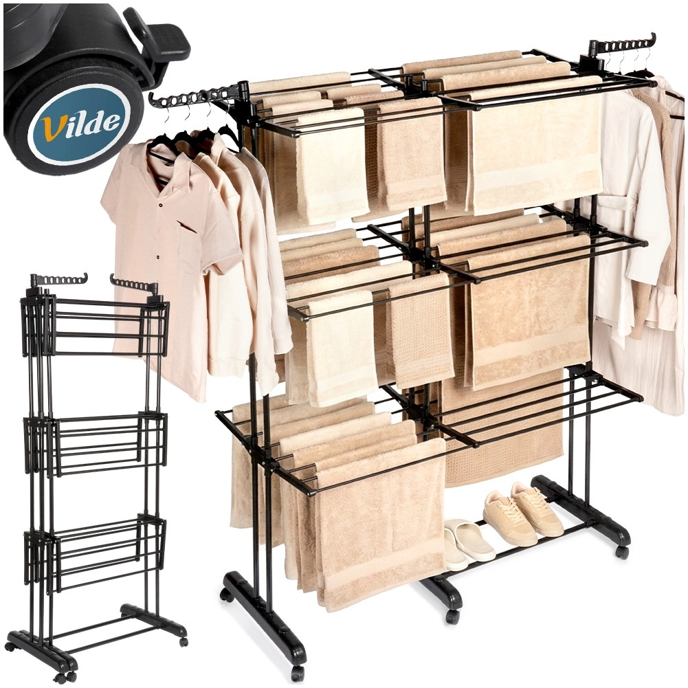 Den robuste ramme af pulverlakeret metal er modstandsdygtig over for fugt, og takket være de kraftige stænger deformeres den ikke under belastning. Den teleskopiske bredde på 75–135 cm sparer plads, mens 6 hjul (3 med bremse) sikrer nem flytning og stabil låsning på stedet.