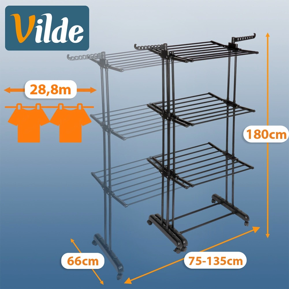 Praktisk vertikalt tørrestativ med teleskopisk bredde 75–135 cm, der tilbyder 3 tørreniveauer, 47 stænger og op til 28,8 m tørreflade. Takket være den stabile metalkonstruktion, 6 hjul med bremse og sammenklappelige arme til bøjler tørrer du nemt både store og små mængder tøj og sparer plads.