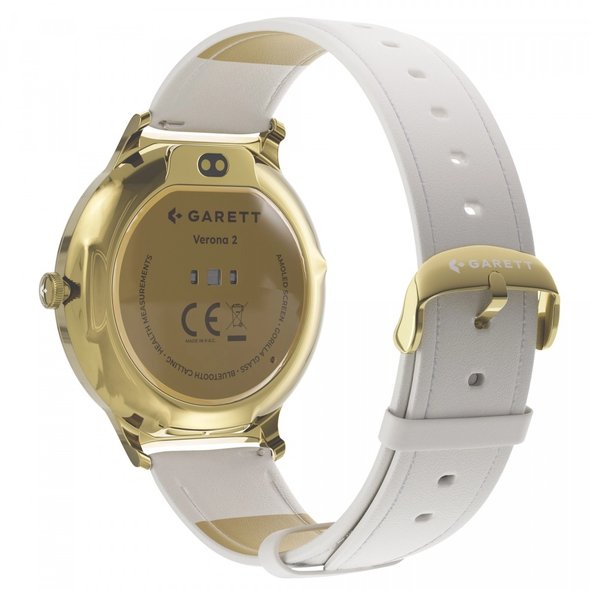 Elegante smartwatch Garett Verona 2 forener tidløst design og moderne teknologi. I æsken finder du både en guldfarvet stålrem og en hvid læderrem, så du nemt kan tilpasse stilen. Uret byder på AMOLED 1,43" (466 × 466) med Always On Display, robust Gorilla Glass, Bluetooth-opkald og stemmeassistent. Over 100 sportsindstillinger, avancerede sundhedsmålinger og batteritid på op til 7 dage gør Verona 2 til den perfekte ledsager i hverdagen.