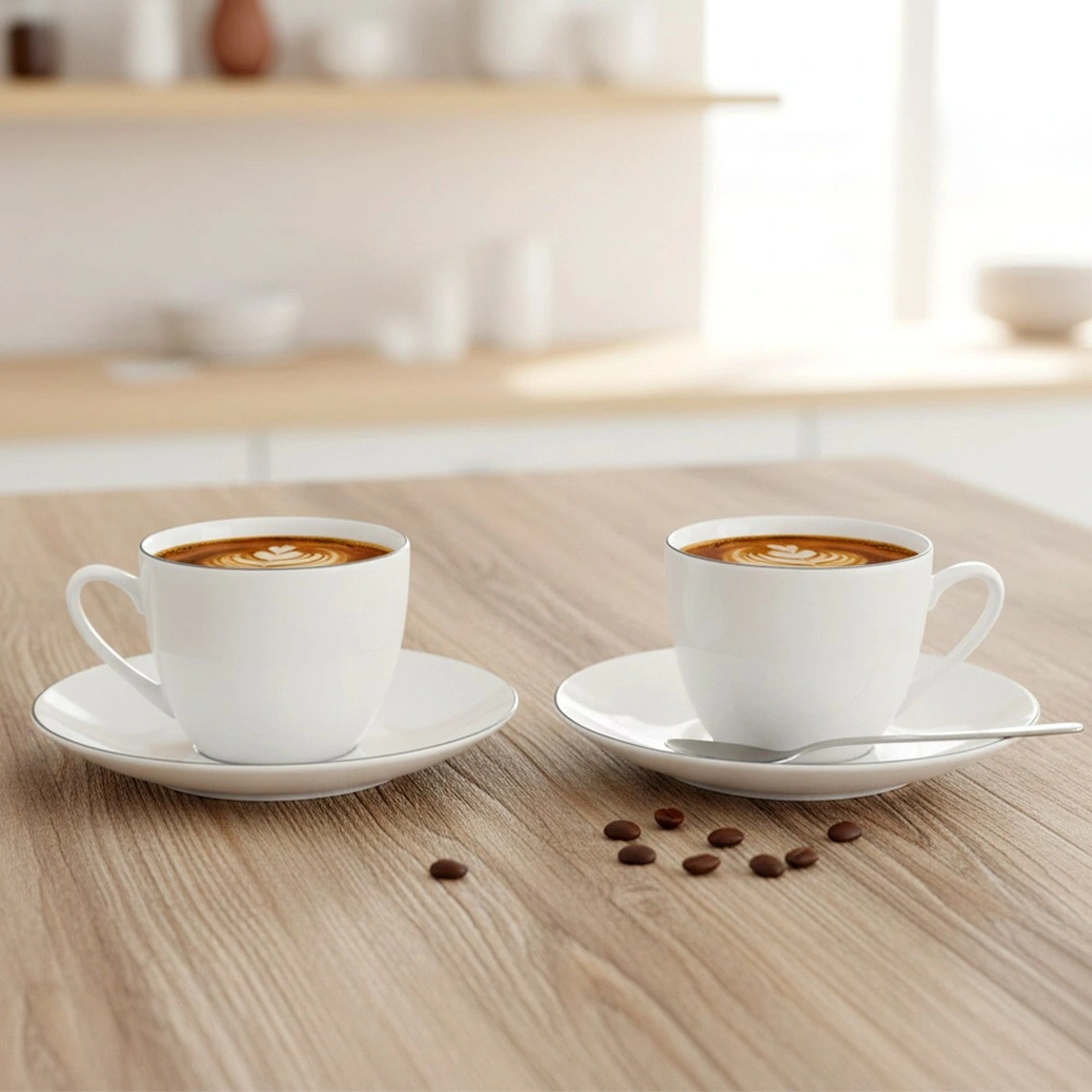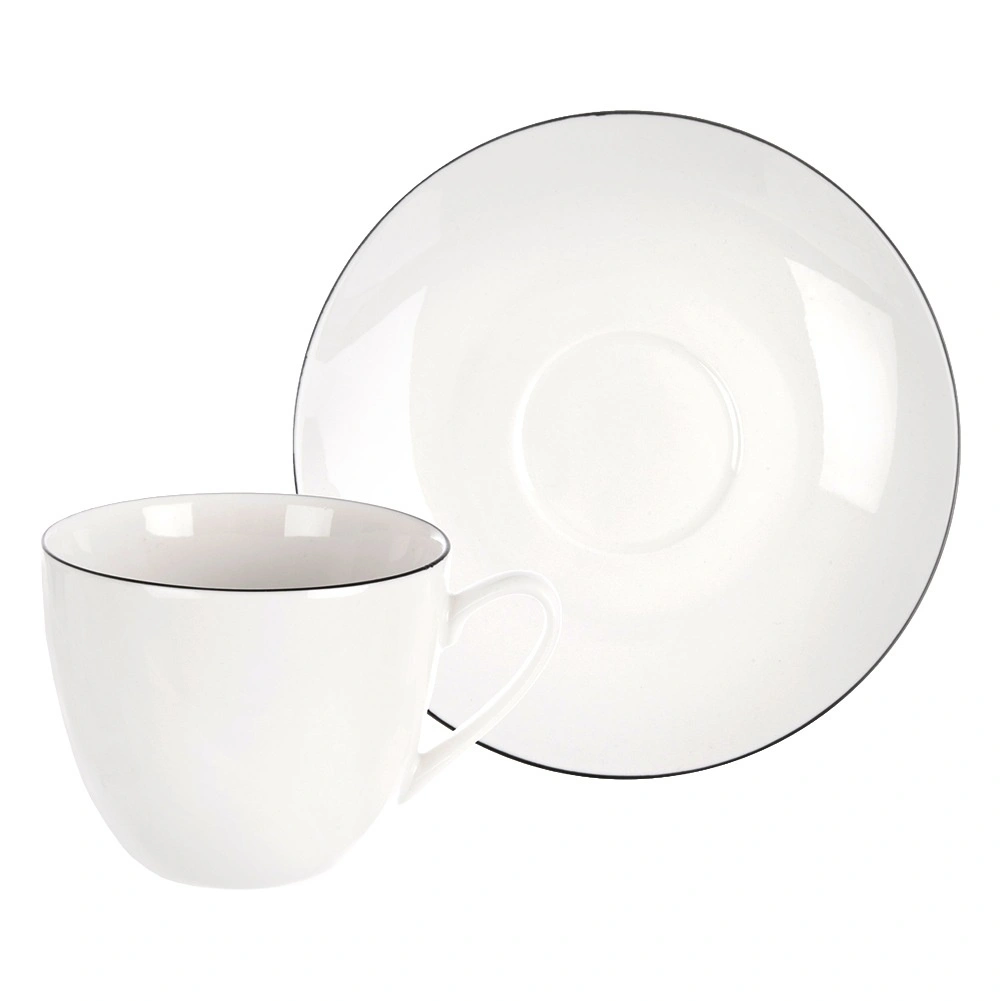 Hvidt porcelæn med en tynd mørk kant passer til både moderne og klassiske interiører og fremhæver serveringen af kaffe og te.