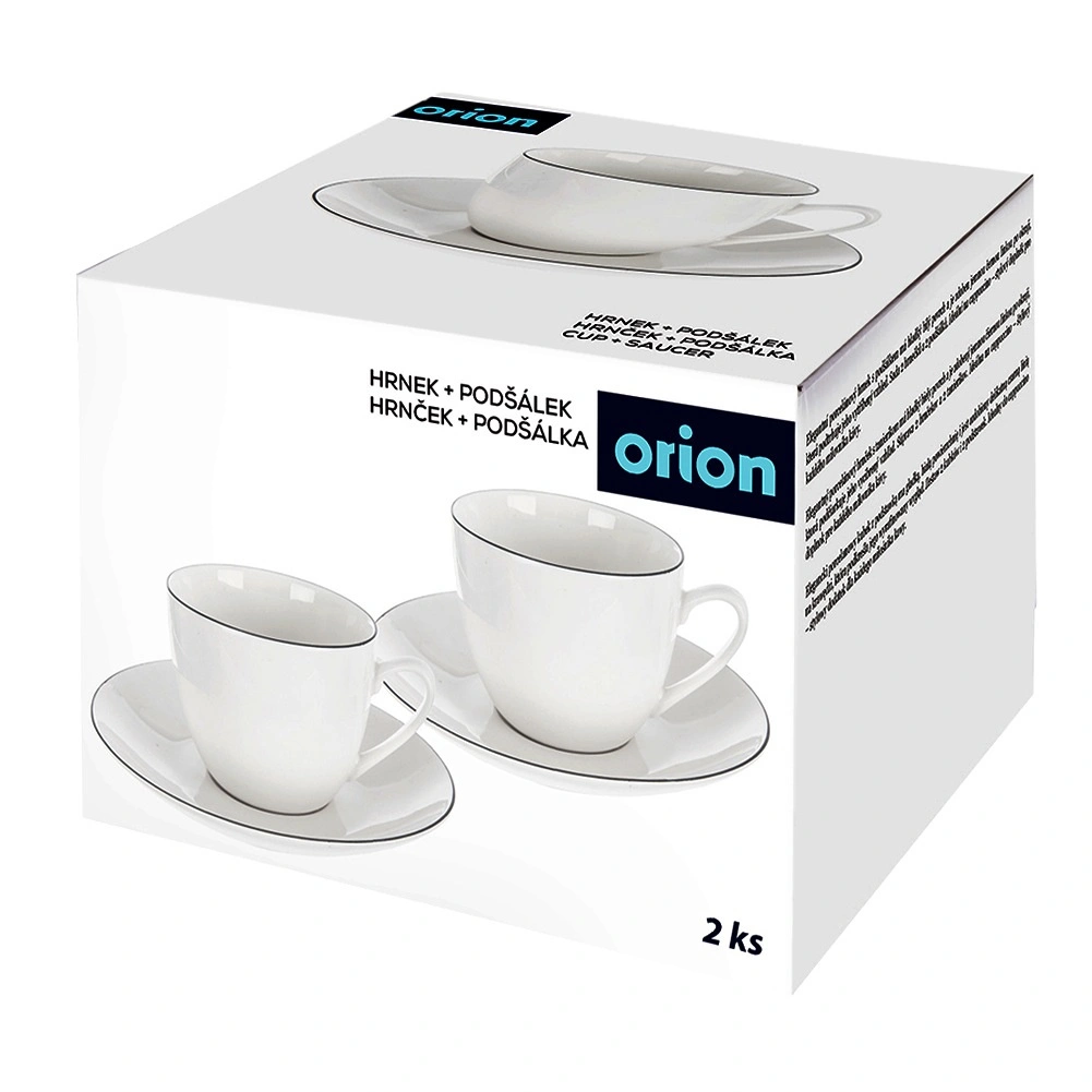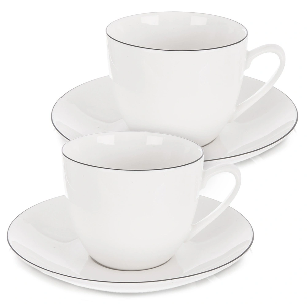Elegant sæt med to hvide porcelænskopper med underkopper på 200 ml til både kaffe og te. Det minimalistiske design kompletteres af en tynd mørk linje langs kanten, som understreger det tidløse udtryk. Kopperne har et ergonomisk håndtag for behageligt greb og kan tåle opvaskemaskine og mikrobølgeovn.