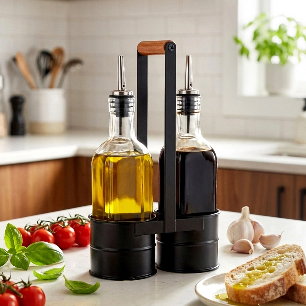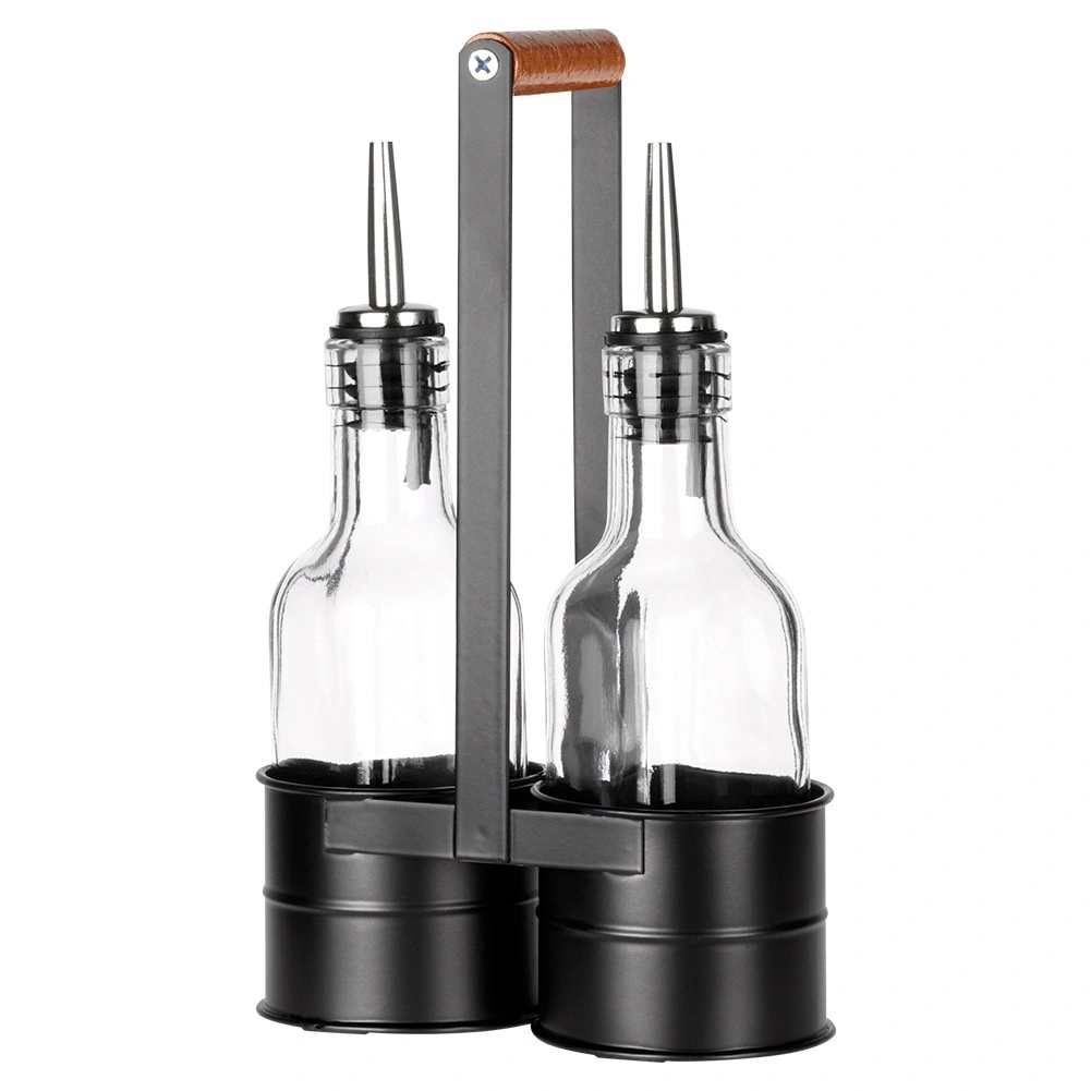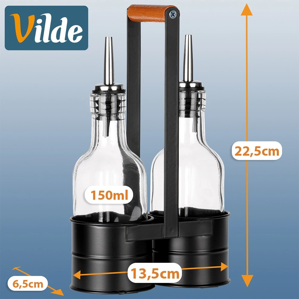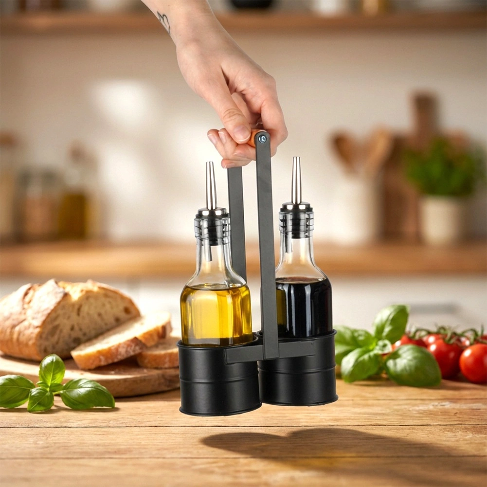 Praktisk sæt med to glasflasker til olie og eddike i et stabilt metalstativ med træhåndtag. Hver flaske har en kapacitet på 150 ml og er udstyret med en hældetud i rustfrit stål for præcis og ren dosering. Det transparente glas giver øjeblikkelig kontrol over indholdet, og det elegante sorte stativ sikrer nem transport og pænt servering ved bordet.