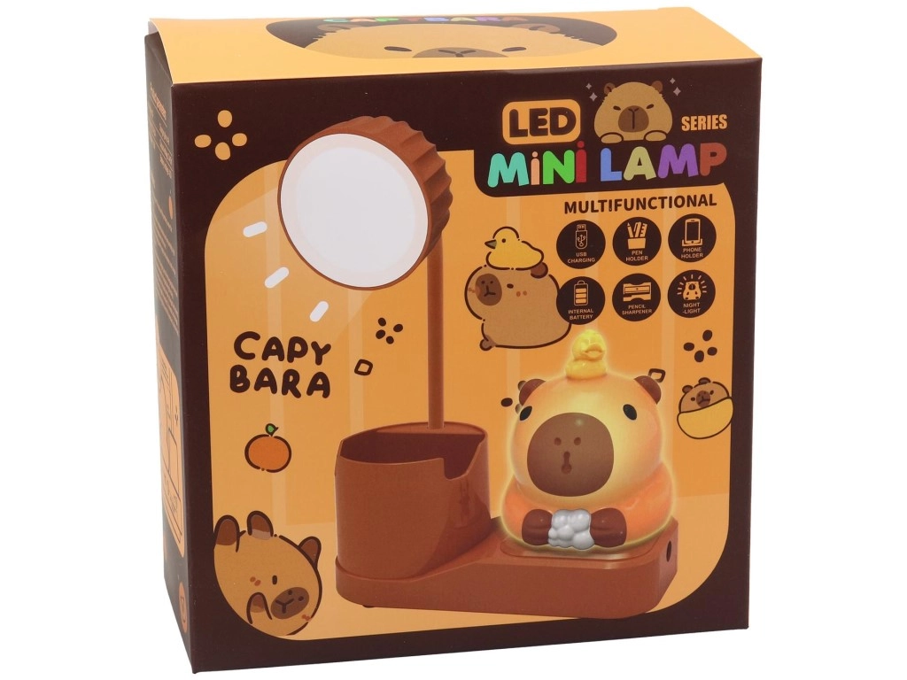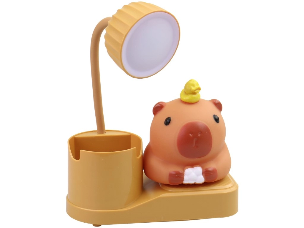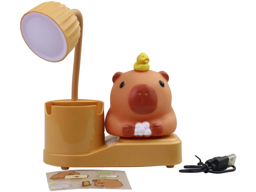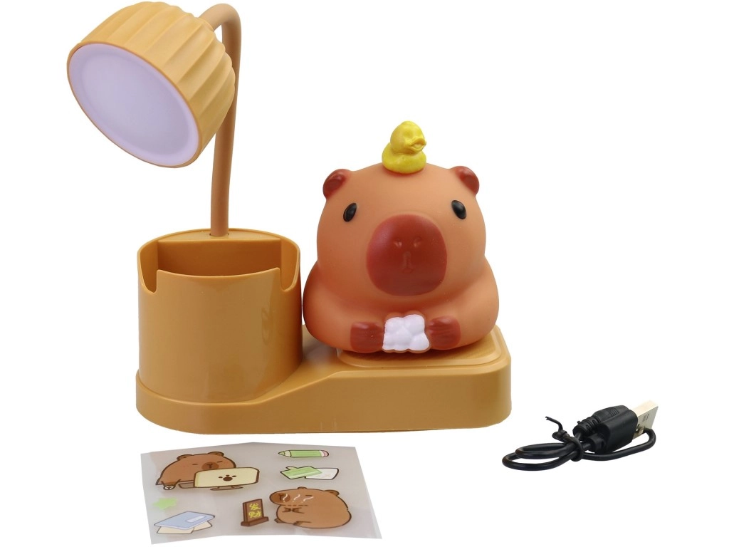 Gør skrivebordet og børneværelset hyggeligt med denne søde lampe med motiv af en kapivara og integreret blyantholder. De kompakte mål (højde 14 cm, bredde 6,5 cm) sparer plads, USB-strøm giver nem brug, og det blide LED-lys er ideelt som natlys og dekorativt element. Velegnet til børn fra 3 år.