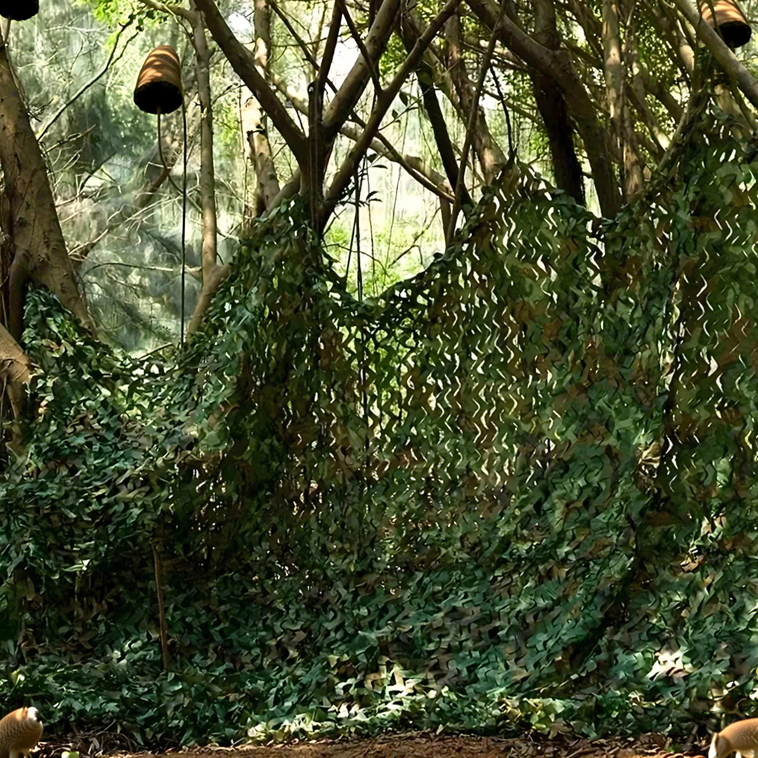 Bladudskæringer og woodland-moro mønster bryder pålideligt konturerne og hjælper nettet med at smelte sammen med den omgivende vegetation. Ideelt til at dække udstyr, hegn eller overdækninger.
