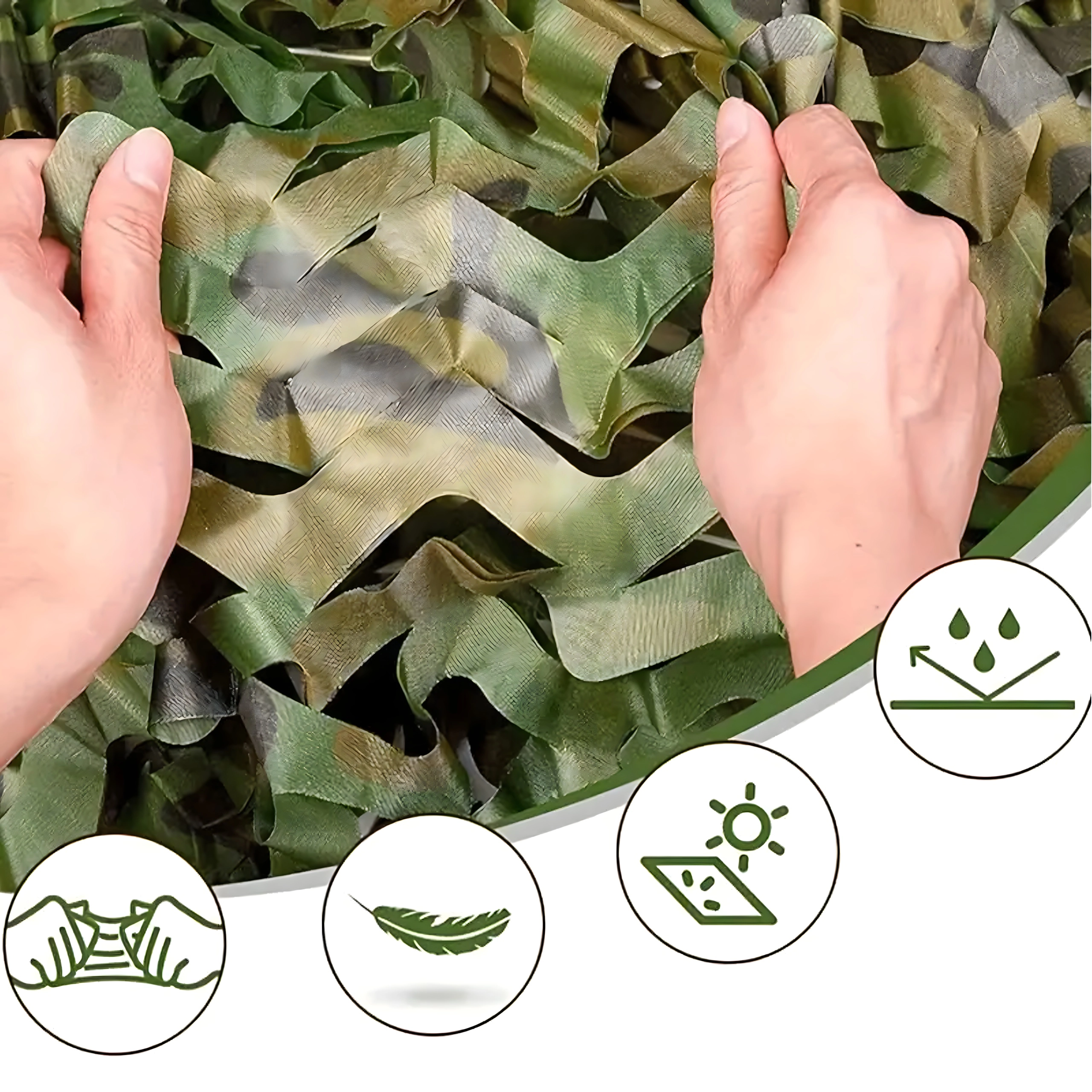 Dette camouflagenet af Oxford-stof kombinerer lav vægt og høj holdbarhed til daglig udendørs brug. Moro-mønsteret med bladudskæringer lader luft passere, skaber behagelig skygge og sikrer visuel dækning af konstruktioner, hegn, udstyr eller siddeområder.