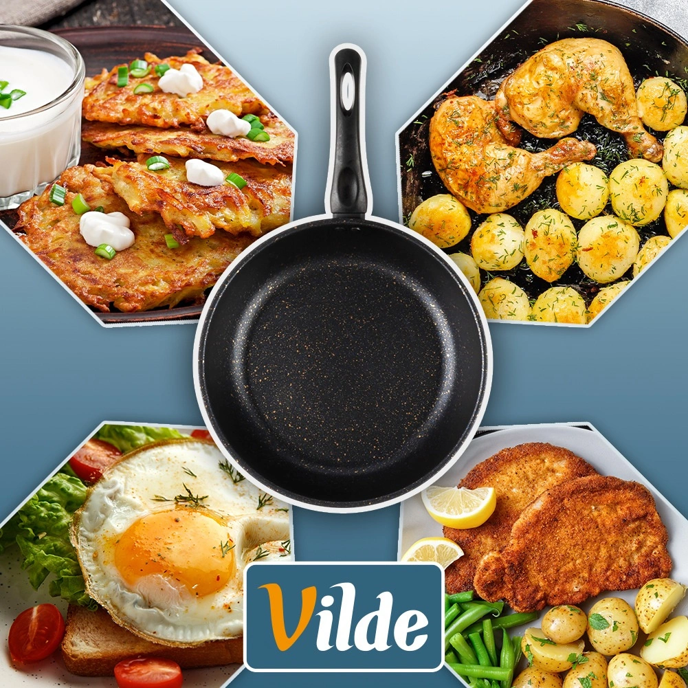 Granit non-stick pande 28 cm er en ideel hjælper til daglig madlavning, stegning og simring. Overfladen med graniteffekt sikrer nem frigivelse af råvarer og hurtig rengøring, så du tilbereder skånsomme og velsmagende retter med mindre fedt.