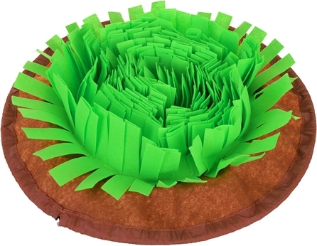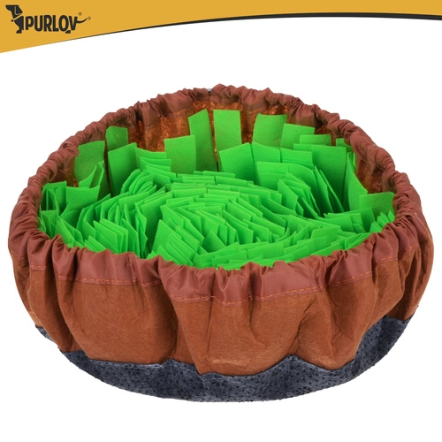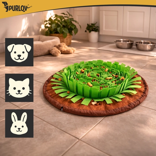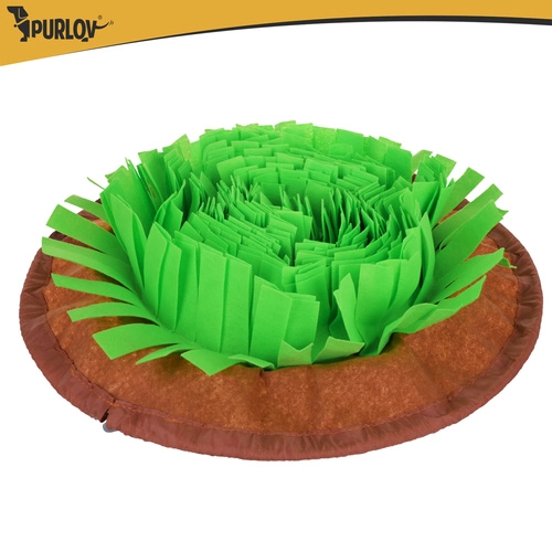 PURLOV snusemåtte gør fodringen til en meningsfuld leg. De tætte lag af bløde strimler i “græs”-look skjuler foderet, så hunden bruger sin mest naturlige instinkt – lugtesansen. Det nedsætter spisehastigheden, fremmer mental stimulering og forbedrer koncentration og ro.