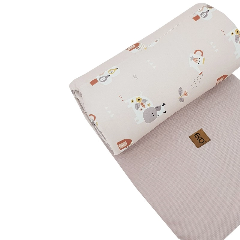 Den elegante og funktionelle sengekant EKO VELVET My Farm udmærker sig ved sin bløde berøring, kvalitetsfyld og tidløse udseende. Kombinationen af 100% bomuld og VELVET-velouroverflade giver barnet komfort og tryghed, mens den hypoallergene, åndbare fyldning dæmper stød mod tremmesengens sider.