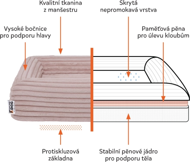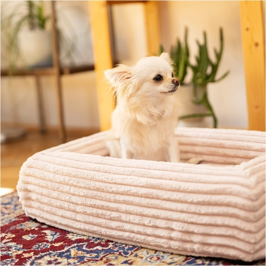 De høje sidestykker giver hunden støtte og en hyggelig følelse, mens den skridsikre underside forhindrer at sengen glider på både klinker og trægulv/laminat.