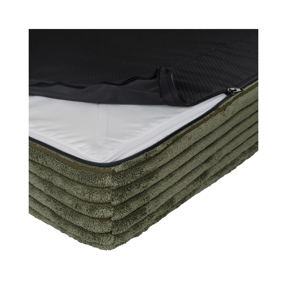 Betrækket af blød fløjl (100% polyester) med OEKO-TEX Standard 100-certificering er behageligt at røre ved, tørrer hurtigt og er mere modstandsdygtigt over for lugt. Skumkernen opfylder de strenge krav i CertiPUR-US – uden formaldehyd og tungmetaller. Takket være YKK-lynlåse kan betrækket let tages af og vaskes i maskine ved 30 °C, mens det vandafvisende indre lag beskytter skummet mod fugt.