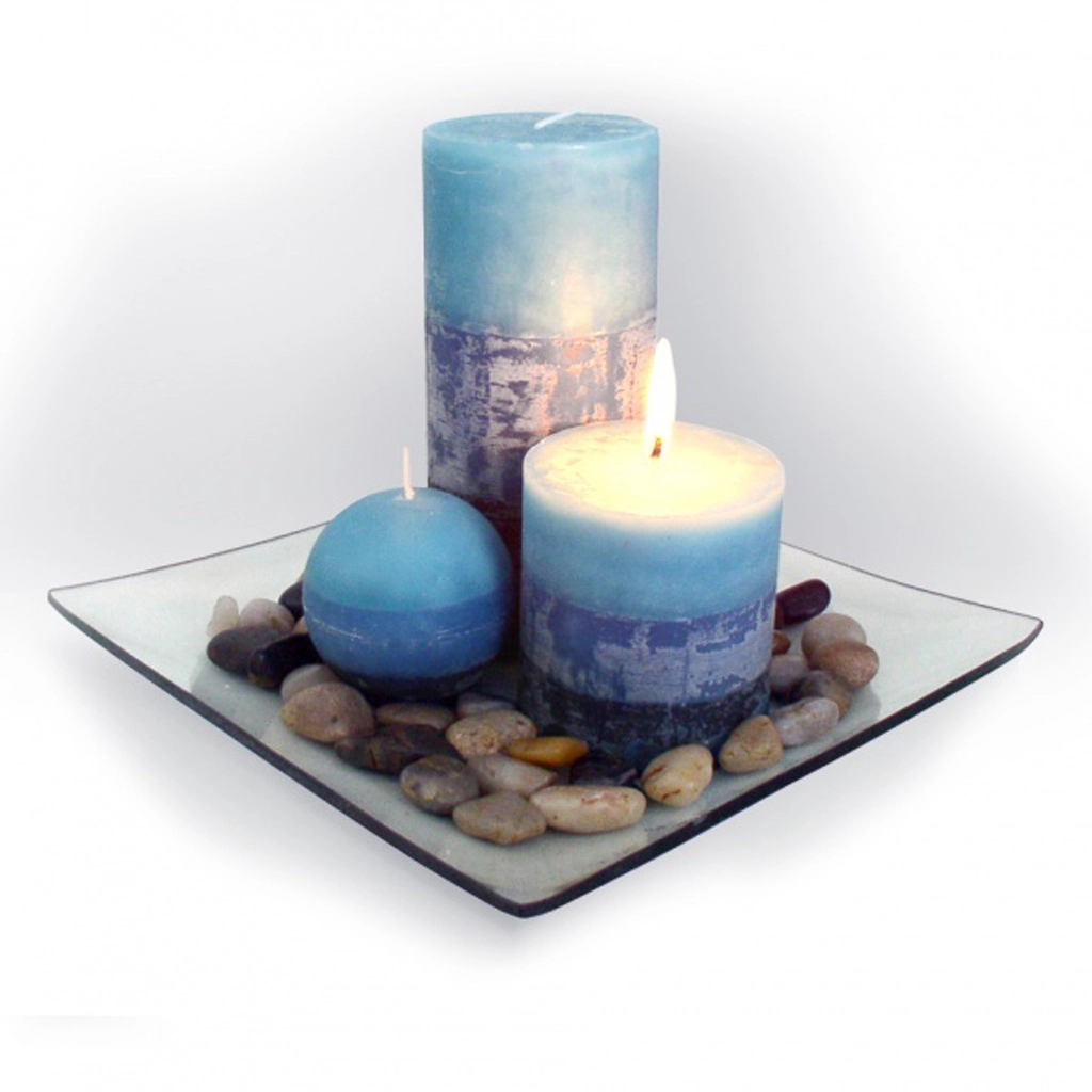 Dette harmonisk afstemte sæt indeholder tre lys i forskellige former og størrelser, som tilsammen skaber en imponerende dekoration. Den intense duft af blåbær fremkalder ro og afslapning, mens glasfadet med naturlige småsten giver et elegant udtryk.