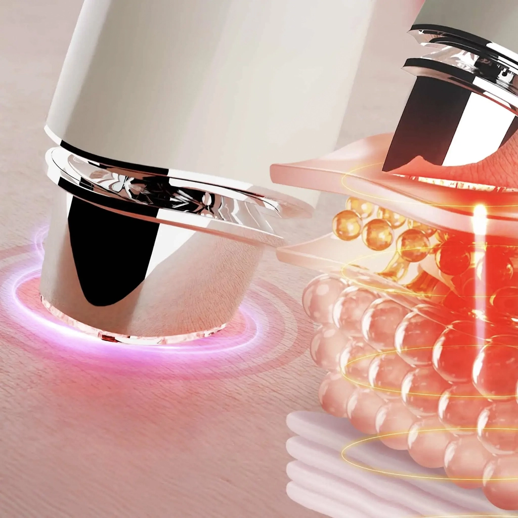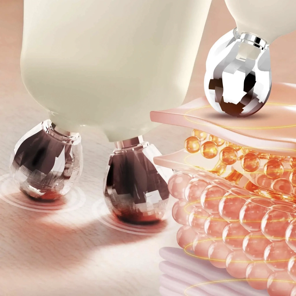 Diamantformede massagepunkter til præcis formning af linjer samt et fladt hoved med otte kontaktpunkter til at give glød, berolige og støtte mikrocirkulationen ved hjælp af lys og vibrationer.