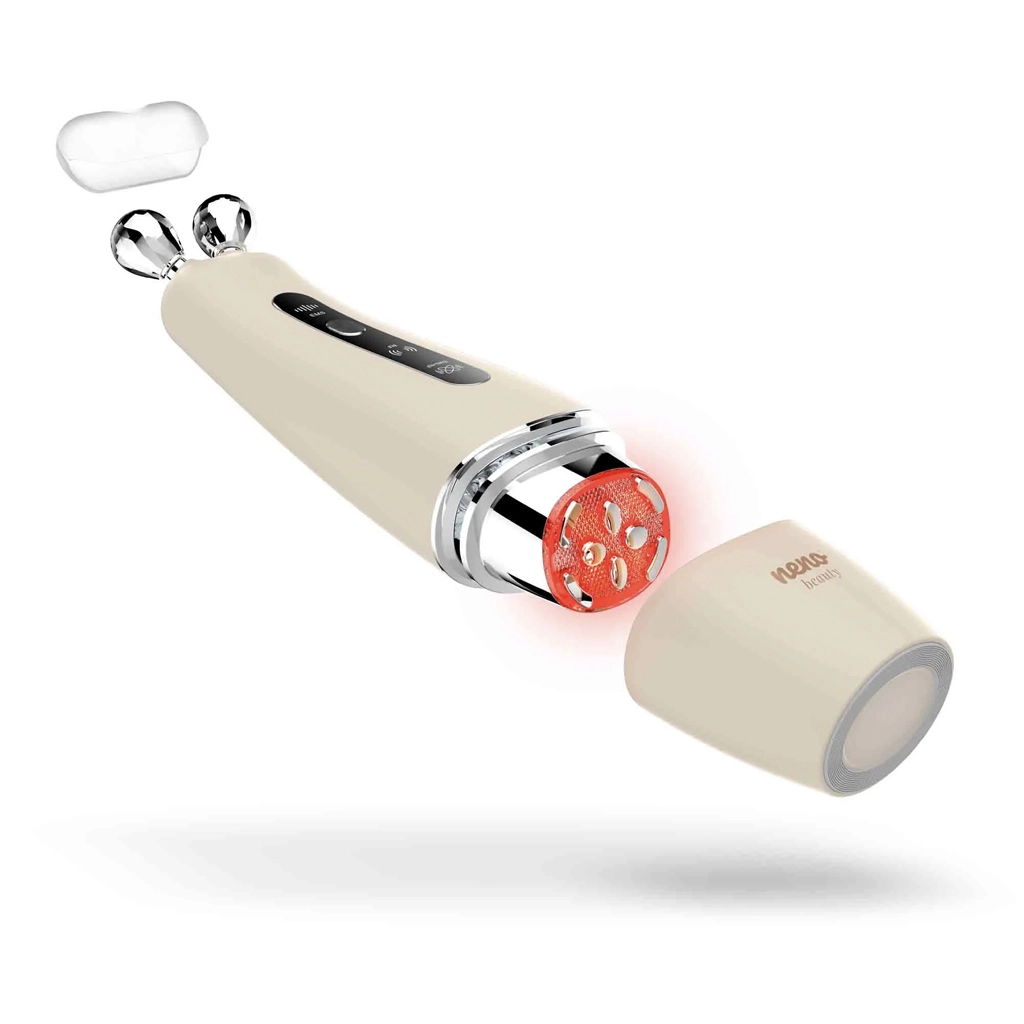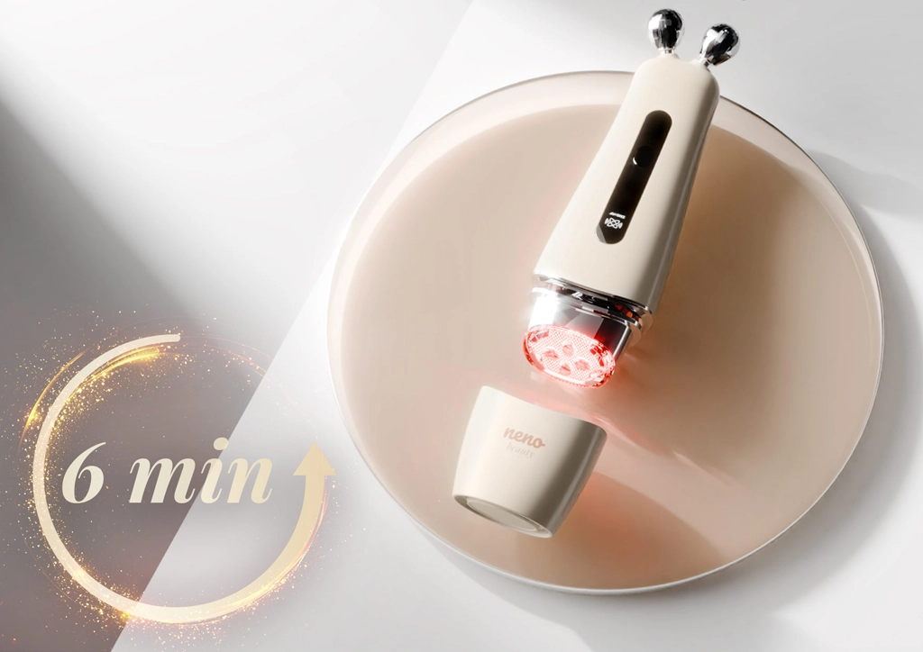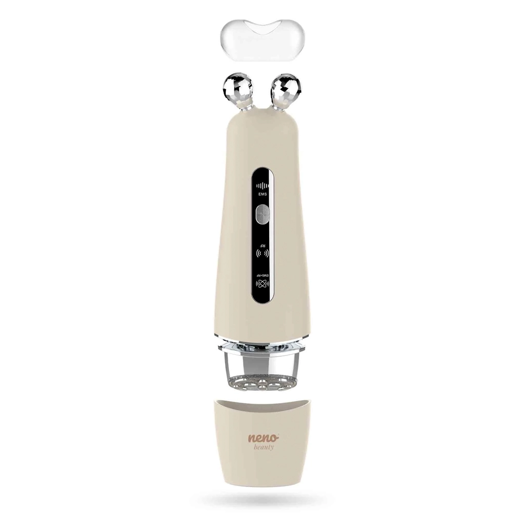 Neno Beauty Algo er et multifunktionelt kosmetisk apparat til hjemmebrug, som hjælper med at definere konturer, støtte kollagendannelsen og forbedre hudens elasticitet. Det kombinerer avanceret EMS og RF med LED-terapi og soniske vibrationer for at levere målrettet, men skånsom behandling. Takket være de to udskiftelige hoveder – et diamantformet og et fladt med otte massagepunkter – kan du nemt tilpasse plejen til hudtype og aktuelle behov.