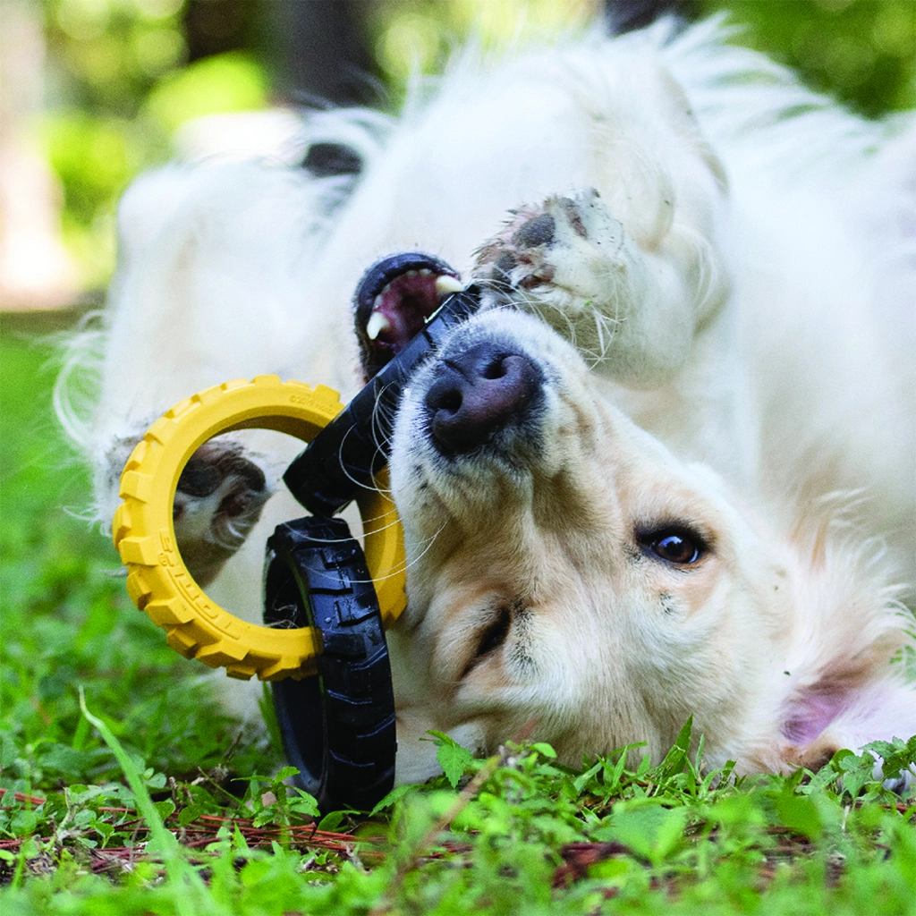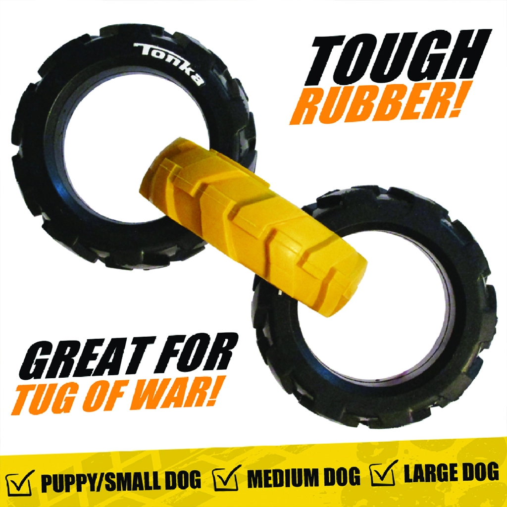 Tonka-legetøjet består af tre robuste ringe med et fleksibelt, dæk-lignende mønster, der ligger godt i både hundens mund og i hånden. Kombinationen af holdbar gummi og smart form klarer intens trækleg og er samtidig sikker til daglig underholdning.