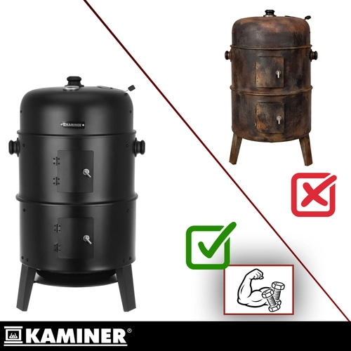Opdag den alsidige KAMINER 3-i-1 grill, som kombinerer grillning, røgning og bålsted i én. Takket være termometer i låget, lufttilførselsregulering og to forkromede riste på 38 cm tilbereder du saftige bøffer og aromatiske pølser med minimal indsats. 8 kroge til røgning, robust stålkonstruktion på 0,9 mm og nem rengøring gør den til et ideelt valg til enhver BBQ.